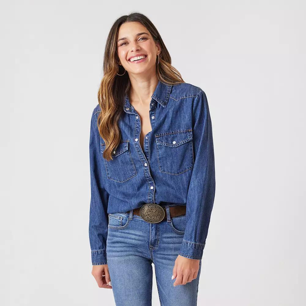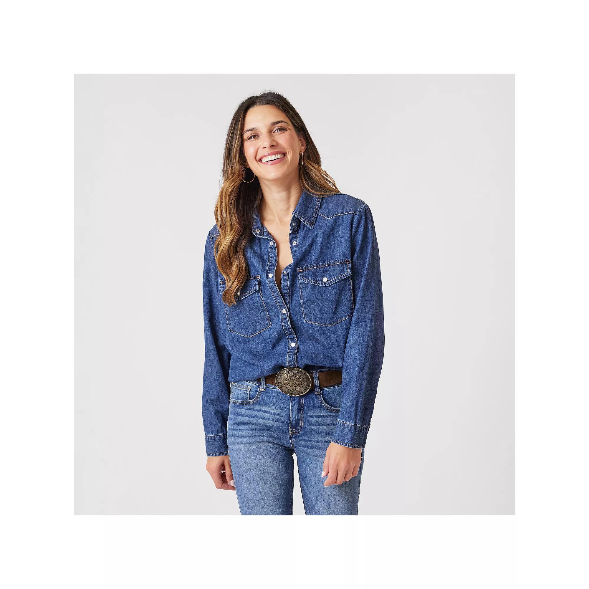 Elevate your wardrobe with this Women's Angels Forever Young Chambray Classic Denim Shirt.Click on this WOMEN'S GUIDE to find the perfect fit and more!Elevate your wardrobe with this Women's Angels Forever Young Chambray Classic Denim Shirt.Click on this WOMEN'S GUIDE to find the perfect fit and more!FEATURES Collared neckline Long sleeves Button cuffs Button front 2 front faux pockets Lightweight chambray denim constructionFIT & SIZING 29-in. length from shoulder to hemFABRIC & CARE Cotton Machine wash and tumble dry low Imported Size: Medium. Color: Denali. Gender: female. Age Group: adult.