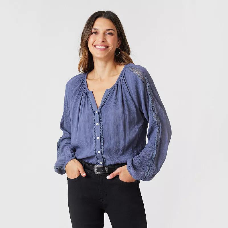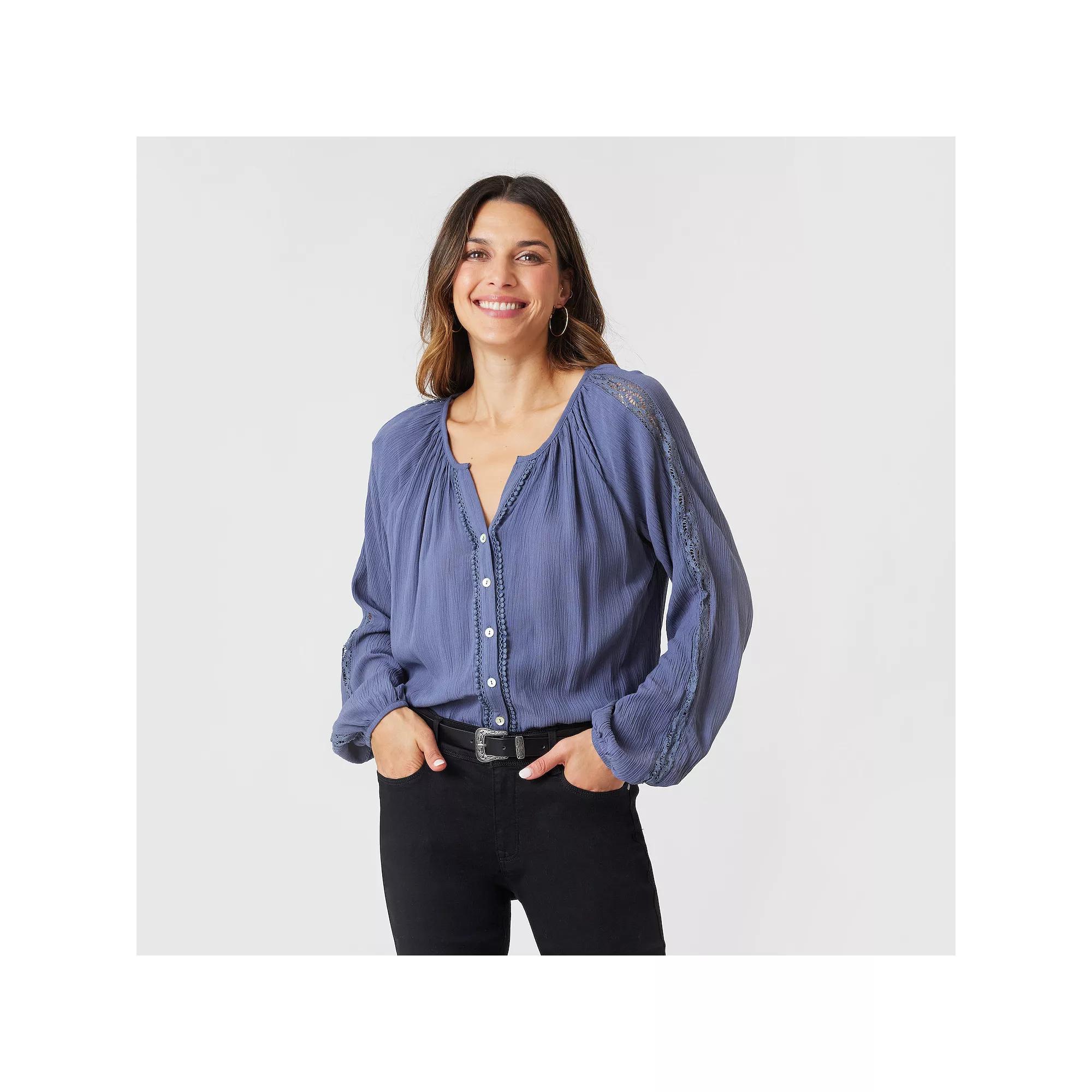 Elevate your wardrobe with this Women's Angels Forever Young Hazel Button Down Blouse.Click on this WOMEN'S GUIDE to find the perfect fit and more!Elevate your wardrobe with this Women's Angels Forever Young Hazel Button Down Blouse.Click on this WOMEN'S GUIDE to find the perfect fit and more!FEATURES Scoopneck Long sleeves Crochet detail sleeves Button front Lightweight, drapey woven rayon gauze constructionFIT & SIZING 25-in. length from shoulder to hemFABRIC & CARE Rayon Machine wash delicate and tumble dry low Imported Size: Large. Color: Grisaille. Gender: female. Age Group: adult.