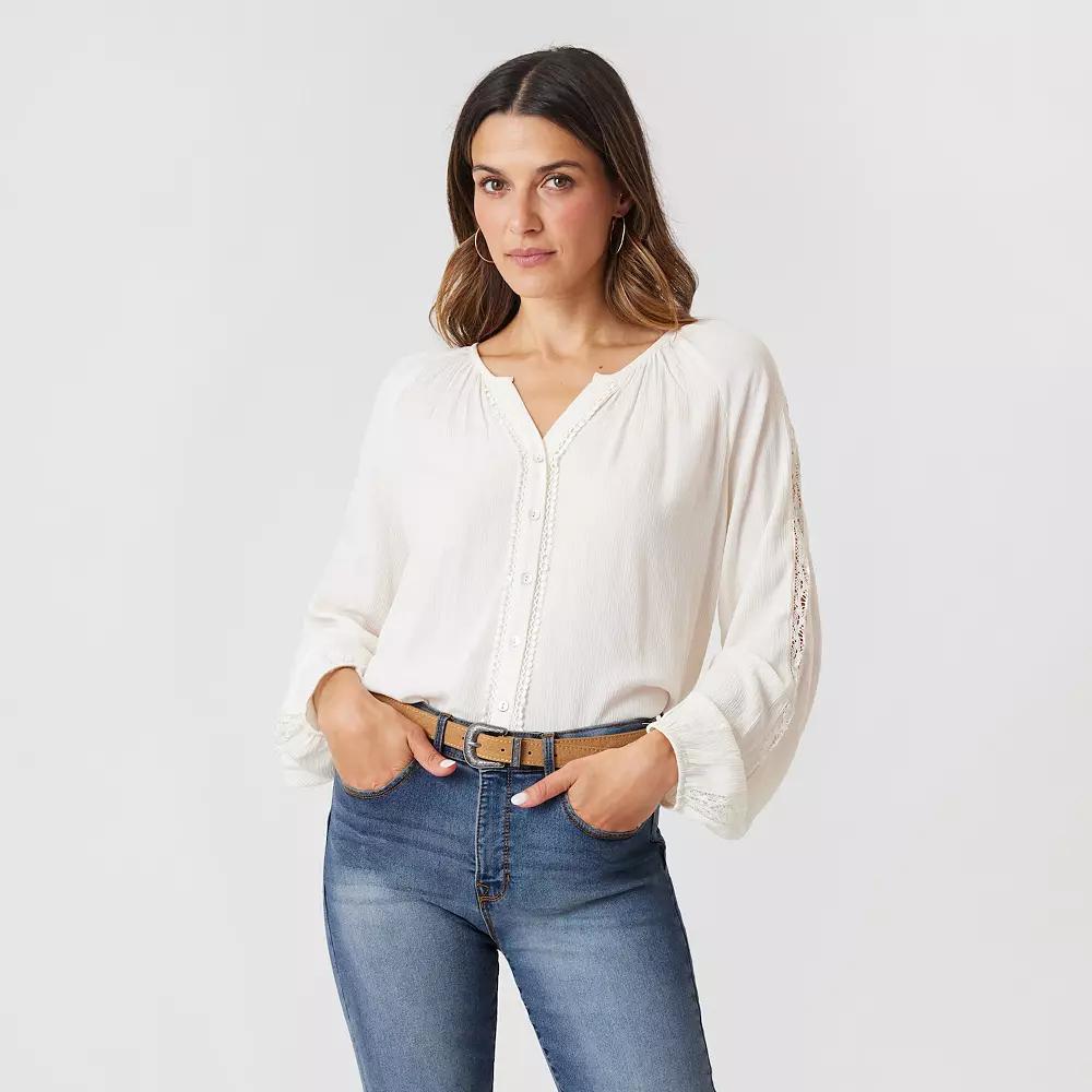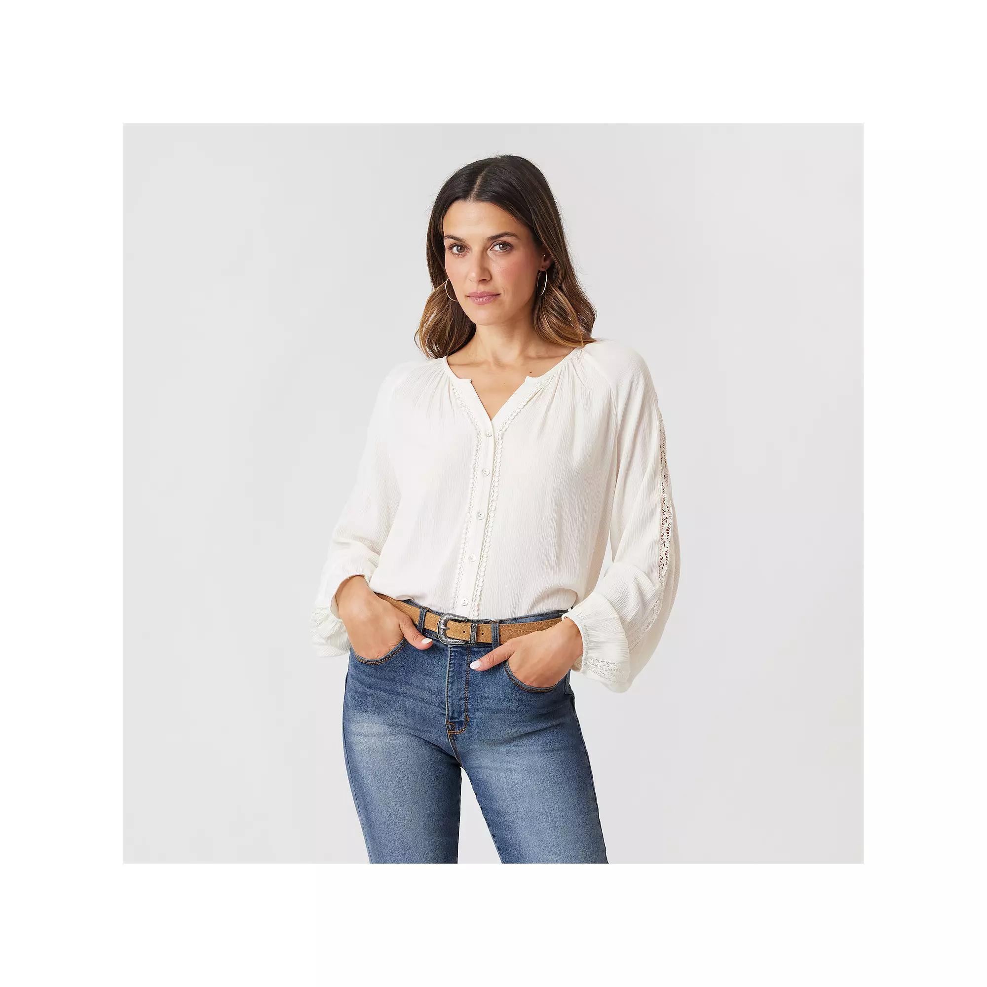 Elevate your wardrobe with this Women's Angels Forever Young Hazel Button Down Blouse.Click on this WOMEN'S GUIDE to find the perfect fit and more!Elevate your wardrobe with this Women's Angels Forever Young Hazel Button Down Blouse.Click on this WOMEN'S GUIDE to find the perfect fit and more!FEATURES Scoopneck Long sleeves Crochet detail sleeves Button front Lightweight, drapey woven rayon gauze constructionFIT & SIZING 25-in. length from shoulder to hemFABRIC & CARE Rayon Machine wash delicate and tumble dry low Imported Size: X Large. Color: Whisper White. Gender: female. Age Group: adult.