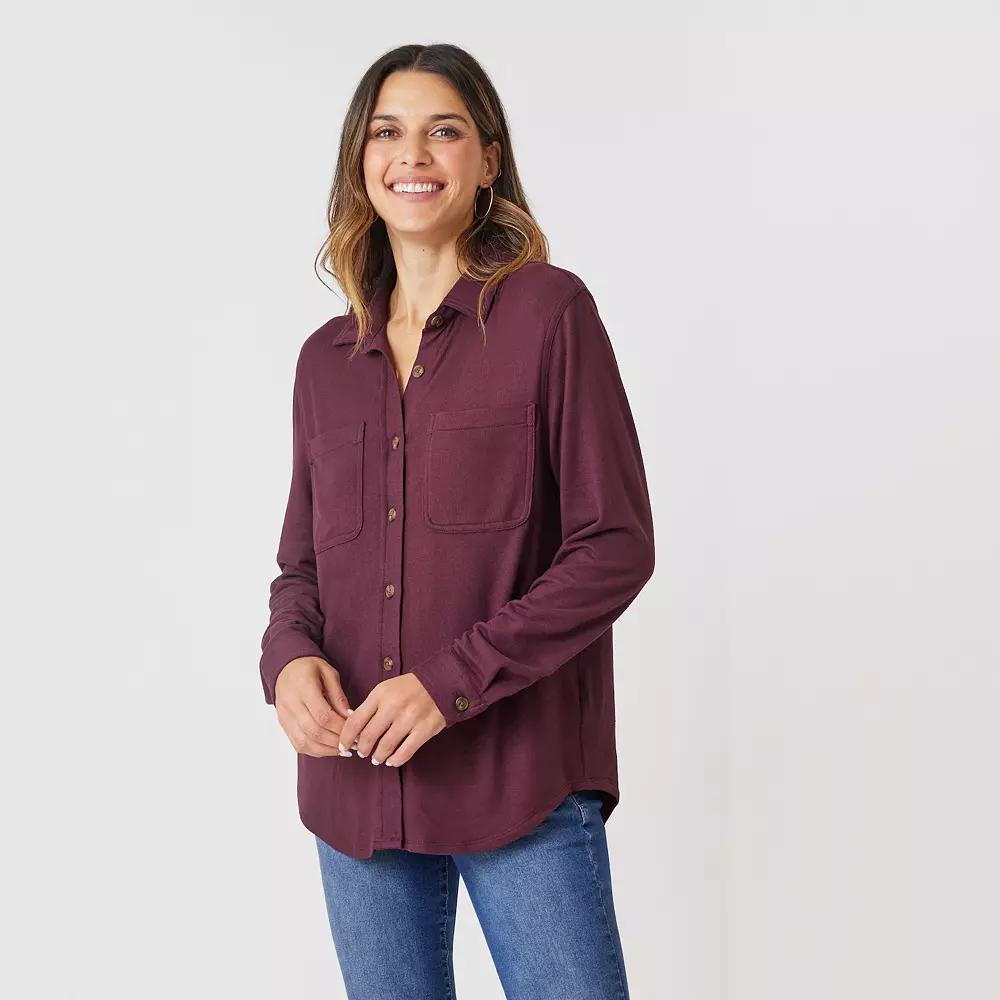 Elevate your wardrobe with this Women's Angels Forever Young Marina Luxe Knit Shirt.Click on this WOMEN'S GUIDE to find the perfect fit and more!Elevate your wardrobe with this Women's Angels Forever Young Marina Luxe Knit Shirt.Click on this WOMEN'S GUIDE to find the perfect fit and more!FEATURES Collared neckline Long sleeves Button front Luxe knit construction 2 faux front pocketsFIT & SIZING Relaxed knit 27.5-in. length from shoulder to hemFABRIC & CARE Polyester, spandex Machine wash and tumble dry low Imported Size: Medium. Color: Winetasting. Gender: female. Age Group: adult.