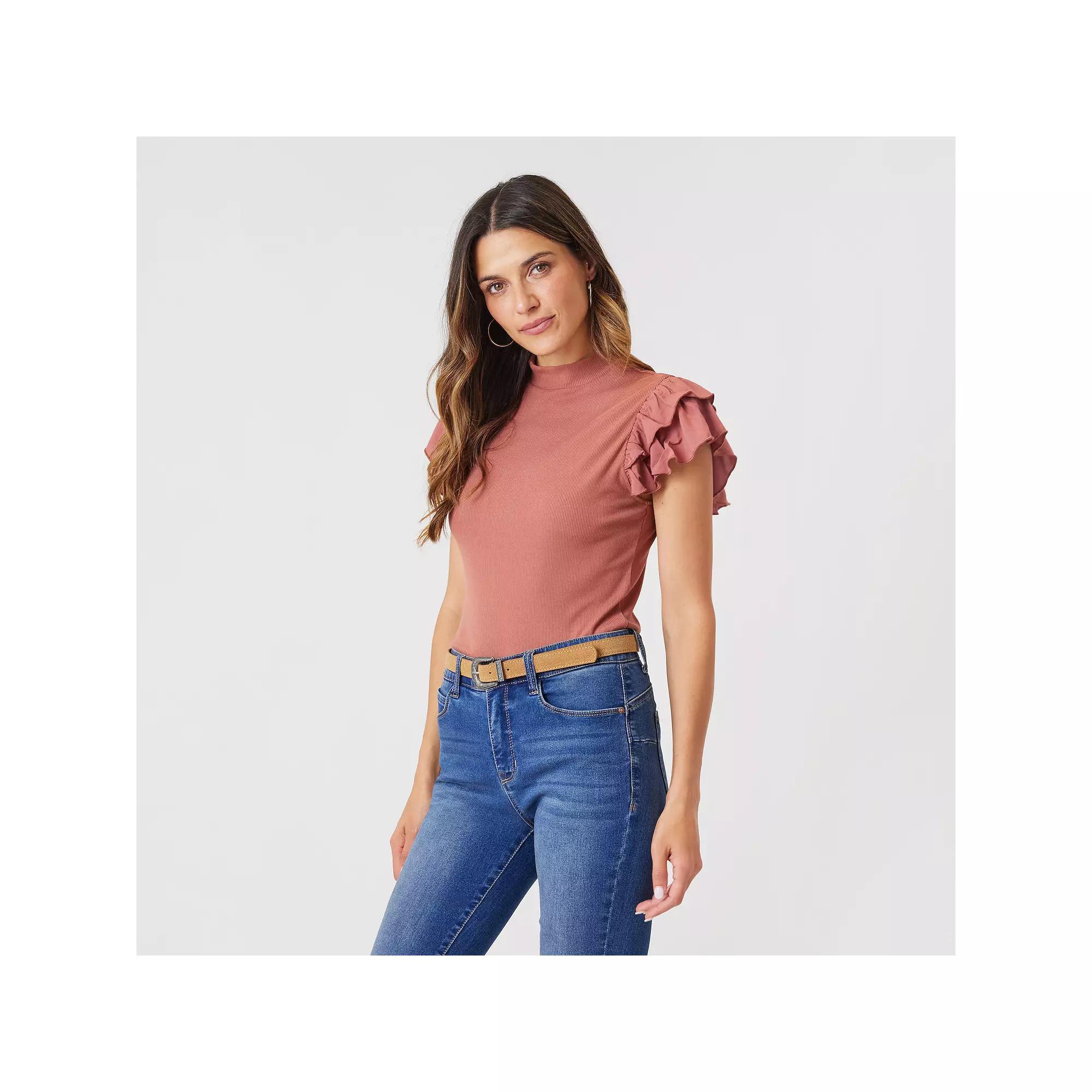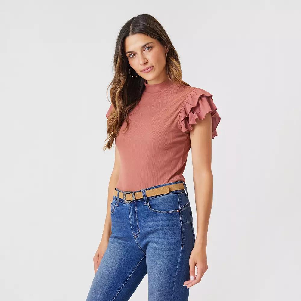 Elevate your wardrobe with this Women's Angels Forever Young Reese Mock Neck Top.Click on this WOMEN'S GUIDE to find the perfect fit and more!Elevate your wardrobe with this Women's Angels Forever Young Reese Mock Neck Top.Click on this WOMEN'S GUIDE to find the perfect fit and more!FEATURES Mockneck Short sleeves Ruffle sleeves Rib knit soft fabric No closure - pullover stylingFIT & SIZING 24-in. length from shoulder to hemFABRIC & CARE Polyester, spandex Machine wash and tumble dry low Imported Size: Large. Color: Chutney. Gender: female. Age Group: adult.