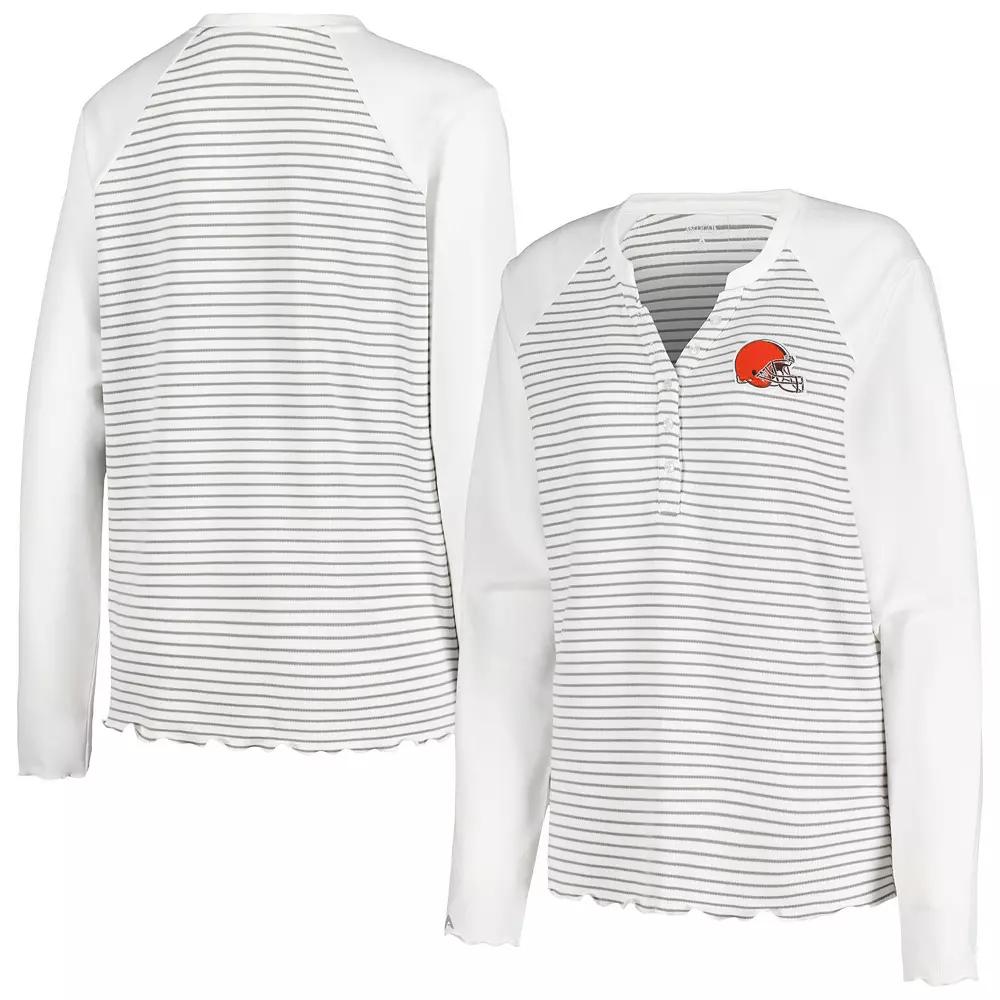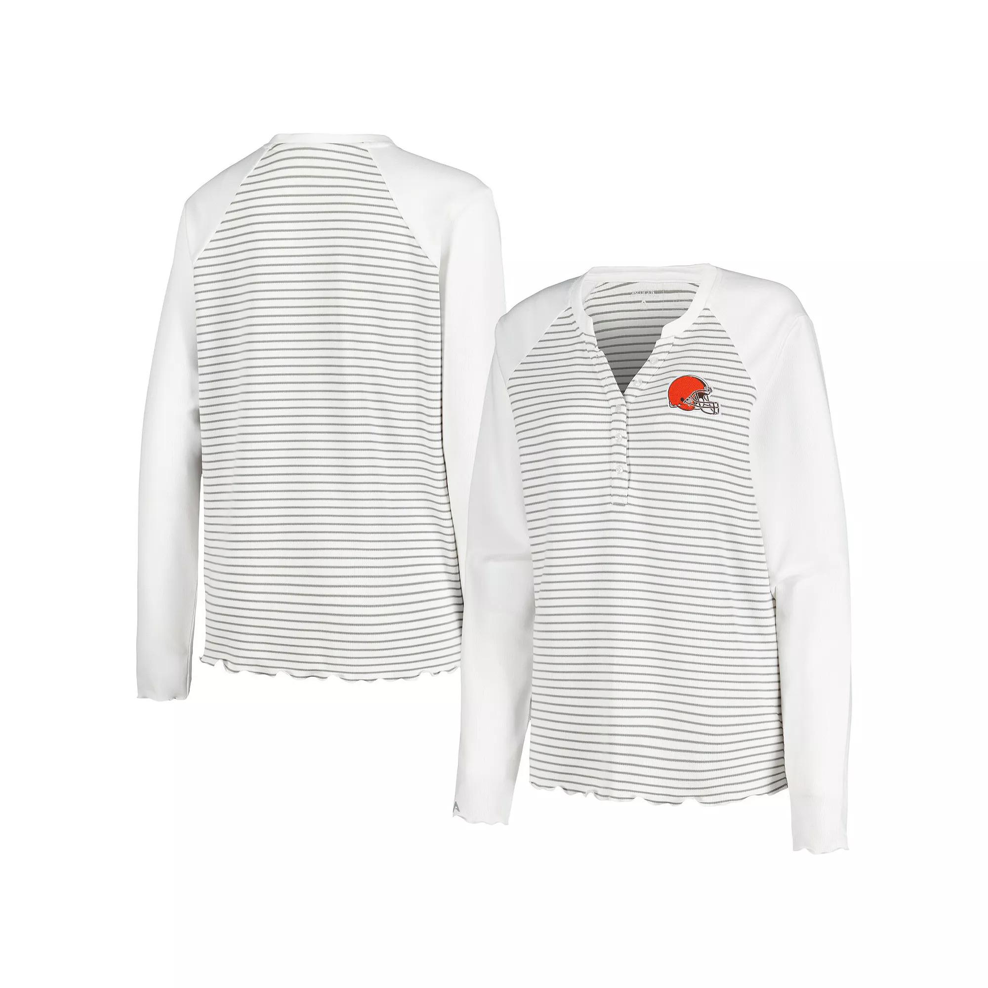Your game day aesthetic will get a major boost with this Cleveland Browns Maverick Waffle Henley Long Sleeve T-Shirt from Antigua. This lightweight top features a striped body and raglan sleeves that make for a stylish look wherever you go. Complete with a five-button placket and embroidered Cleveland Browns graphics, this top is sure to become your new go-to option when you want to highlight your fandom. Brand: Antigua. Long sleeve. Officially licensed. Raglan sleeves. Imported. Five-button placket. Machine wash, line dry. Material: 97% Polyester/3% Spandex. Heat-sealed fabric applique with embroidered details. Contrast overlock stitch at sleeve & bottom hem. Size: 2X. Color: White. Gender: female. Age Group: adult. Material: COTTON.
