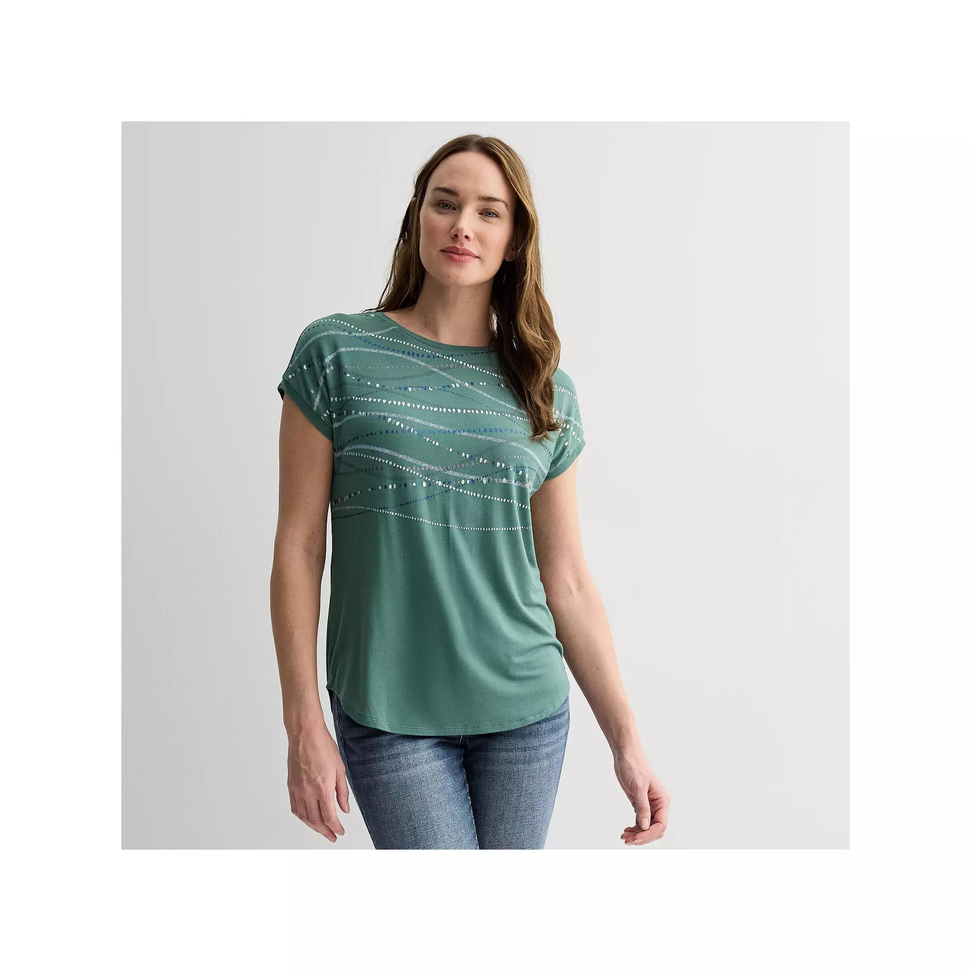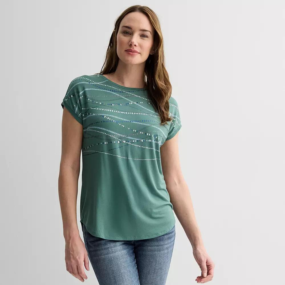 Elevate your everyday with this Women's Apt. 9® Short Sleeve Embellished Top.Click on this WOMEN'S GUIDE to find the perfect fit and more!Elevate your everyday with this Women's Apt. 9® Short Sleeve Embellished Top. Click on this WOMEN'S GUIDE to find the perfect fit and more!FEATURES Rounded hem Dolman short sleeves Unlined CrewneckFIT & SIZING 26 1/2-in. length from shoulder to hemFABRIC & CARE Rayon, spandex, polyester; rayon, spandex Machine wash Imported Size: Medium. Color: Villa Green. Gender: female. Age Group: adult.