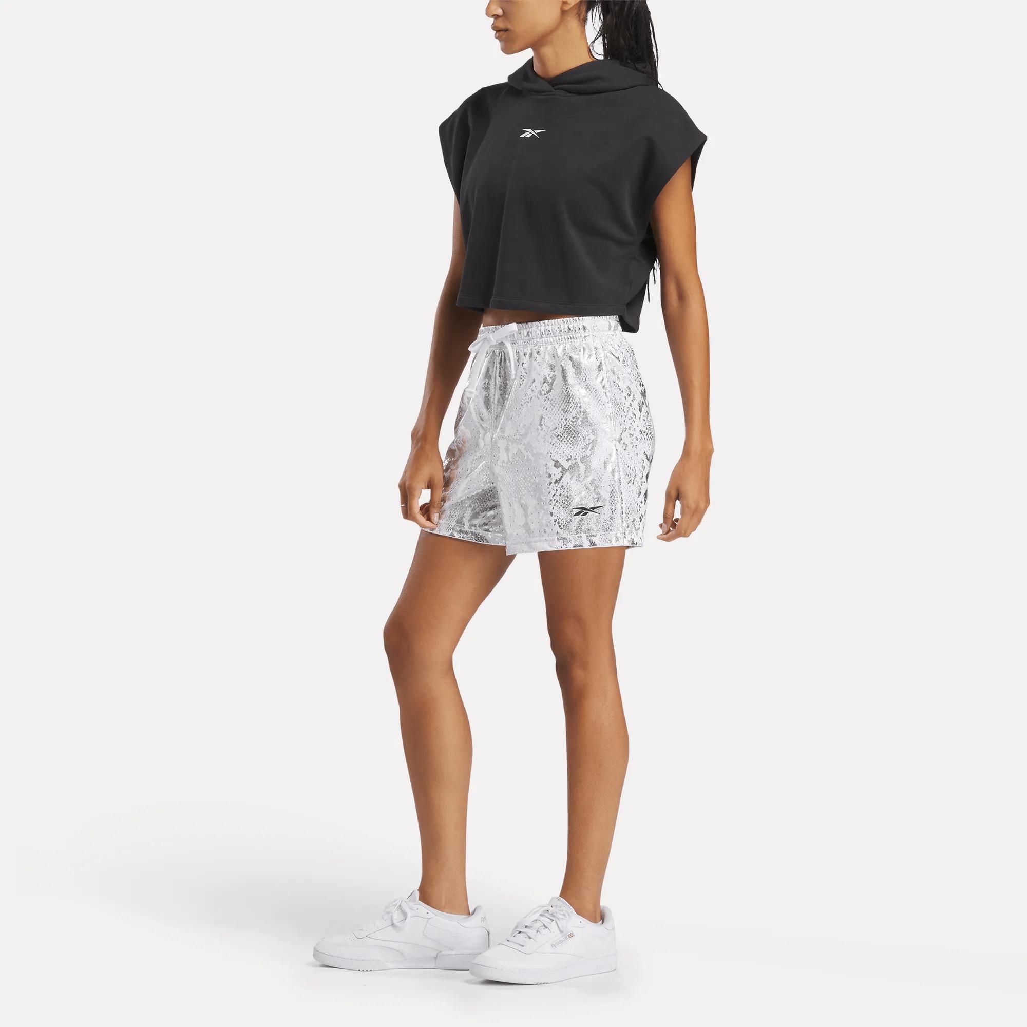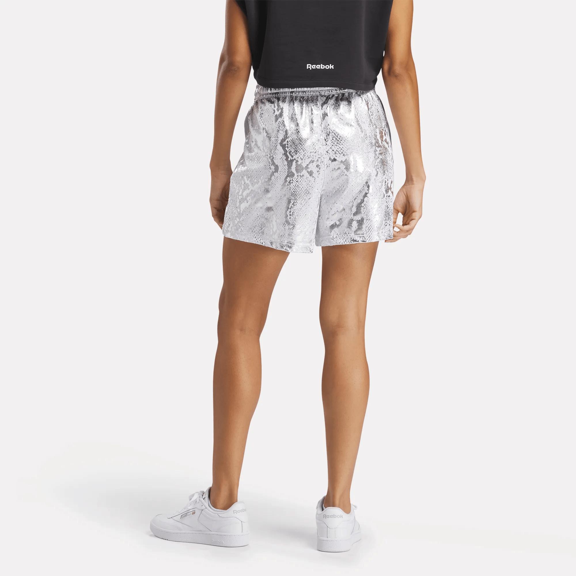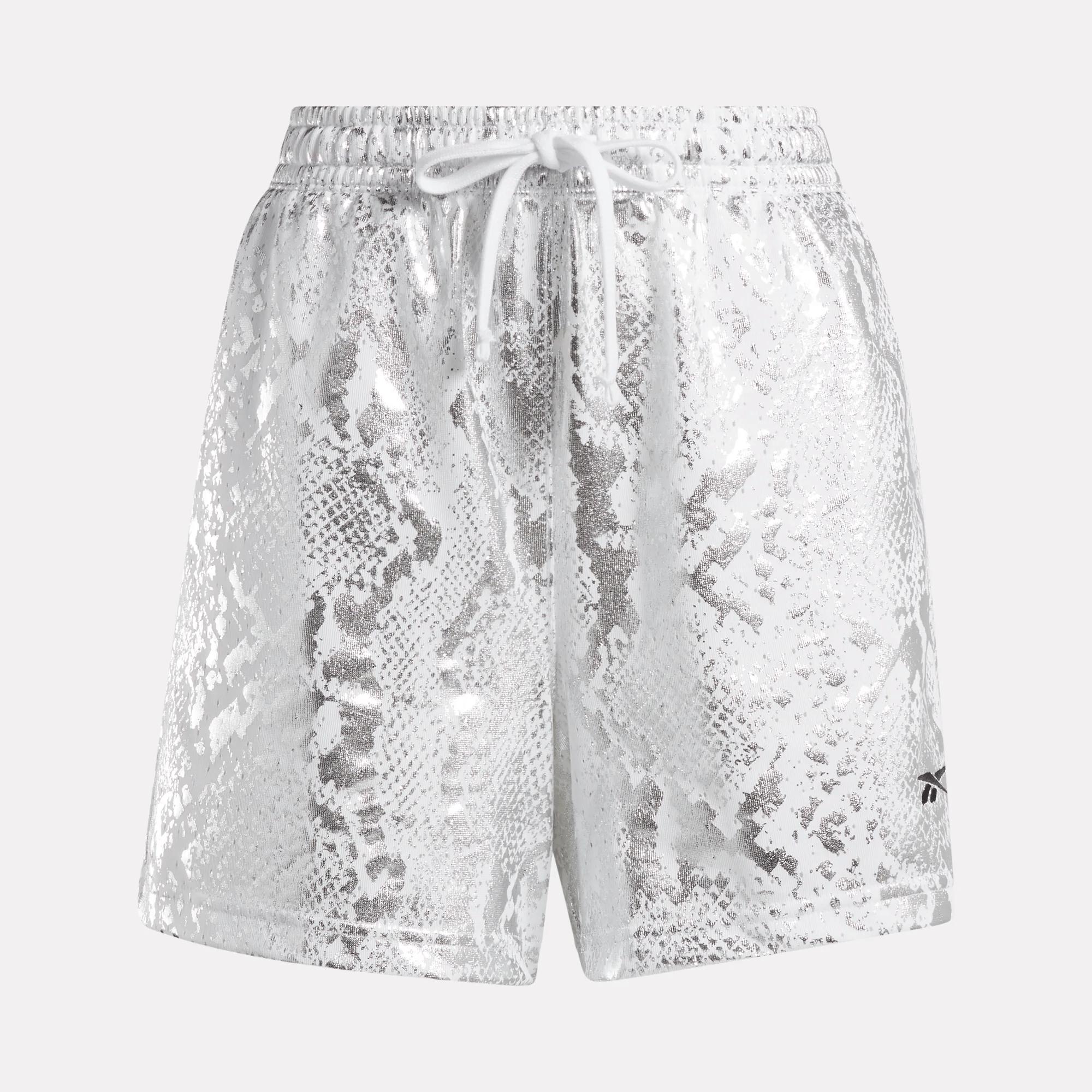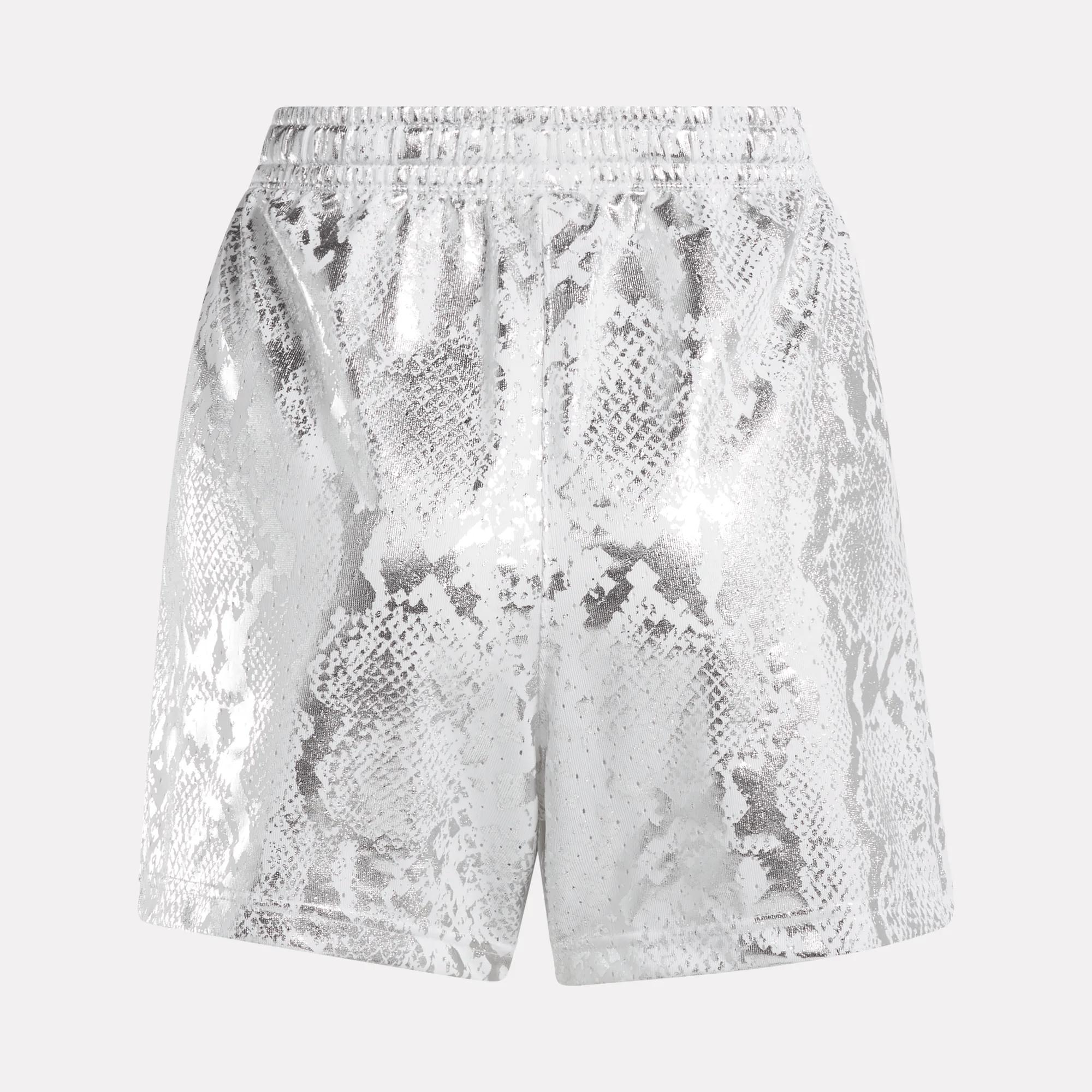 Mesh shorts with hoops-inspired vibesStyle these women's basketball-inspired shorts however you want. Roll the waistband or wear them long because options. A foil snakeskin pattern shows off your fierce attitude. The Reebok Vector signs off the look.