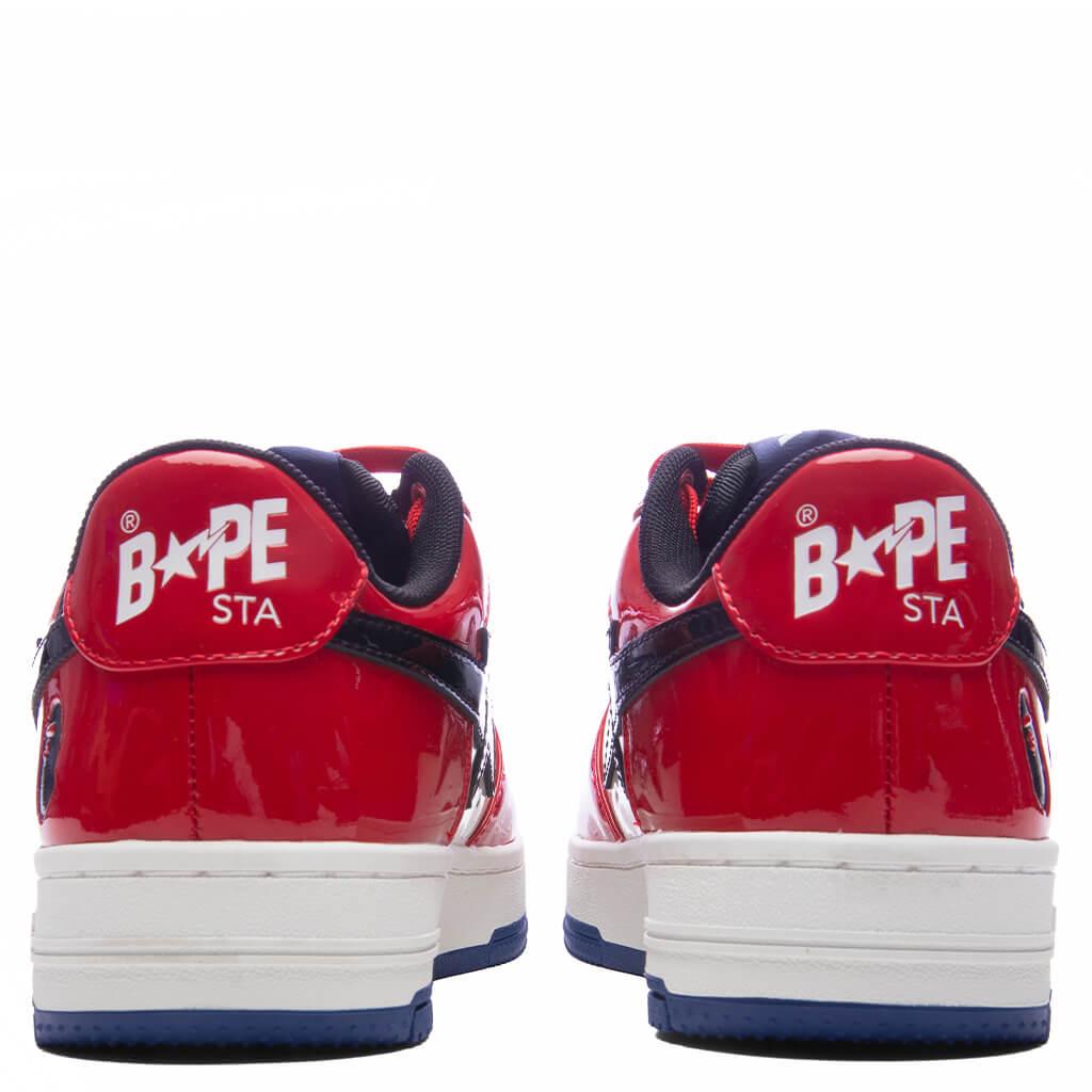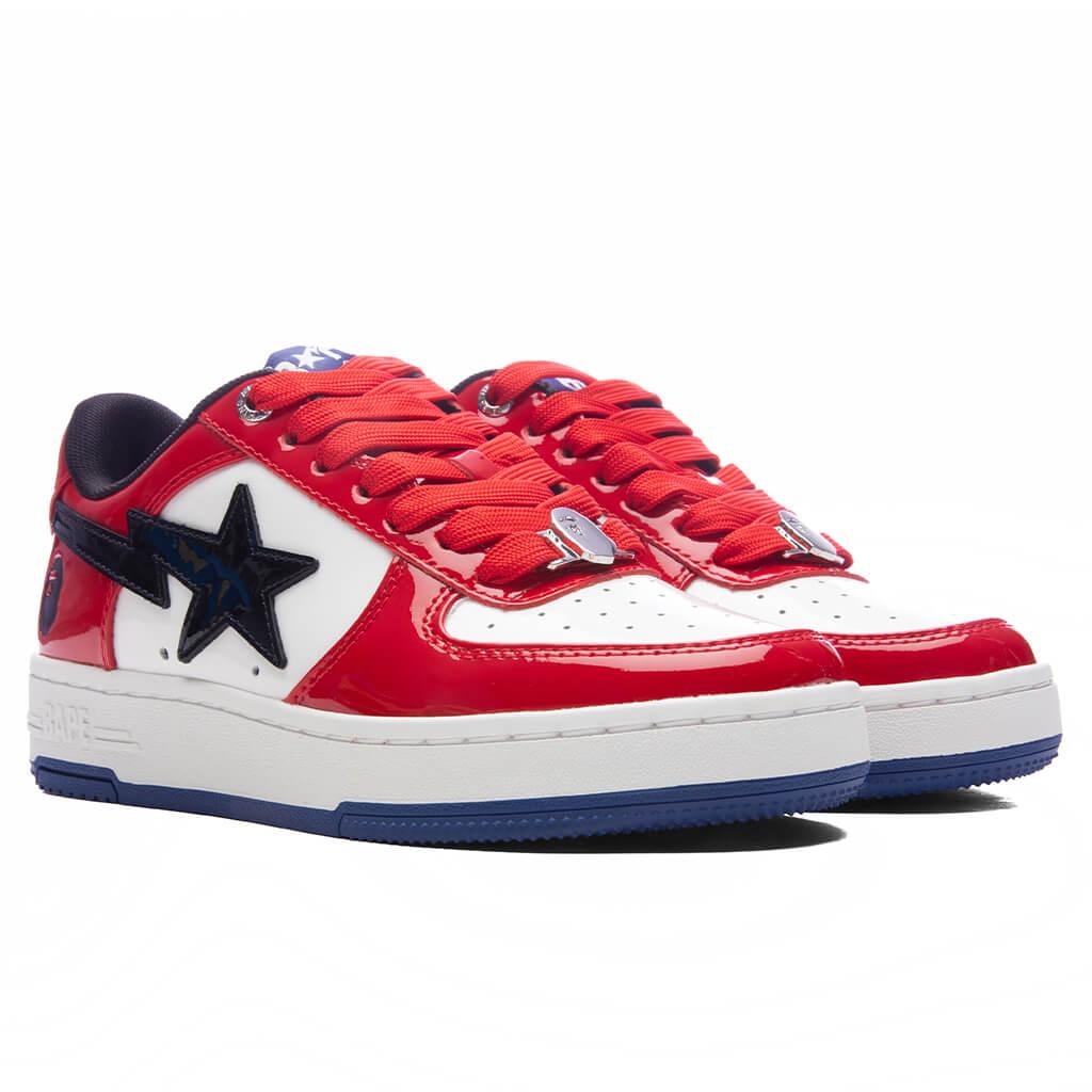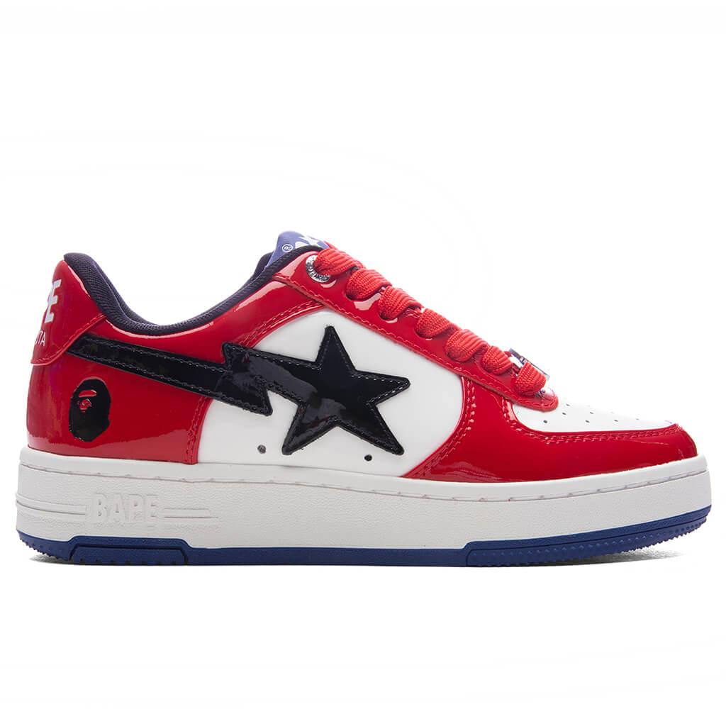 The Bape STA #1 in Red delivers a bold and striking look with its patent leather upper. Highlighted by a crystal-embellished STA logo on the side panel, this sneaker blends statement-making design with timeless details. A perforated toe box enhances breathability, while the rubber midsole and outsole ensure comfort and durability. Finished with a branded dubraé and embroidered heel branding, this style is a standout addition to any collection. Patent leather upper Branded dubraé Embroidered branding on heel Crystal embelished STA on side panel Rubber midsole and outsole Perforated toe box Style No: 001FWK802301L-RED
