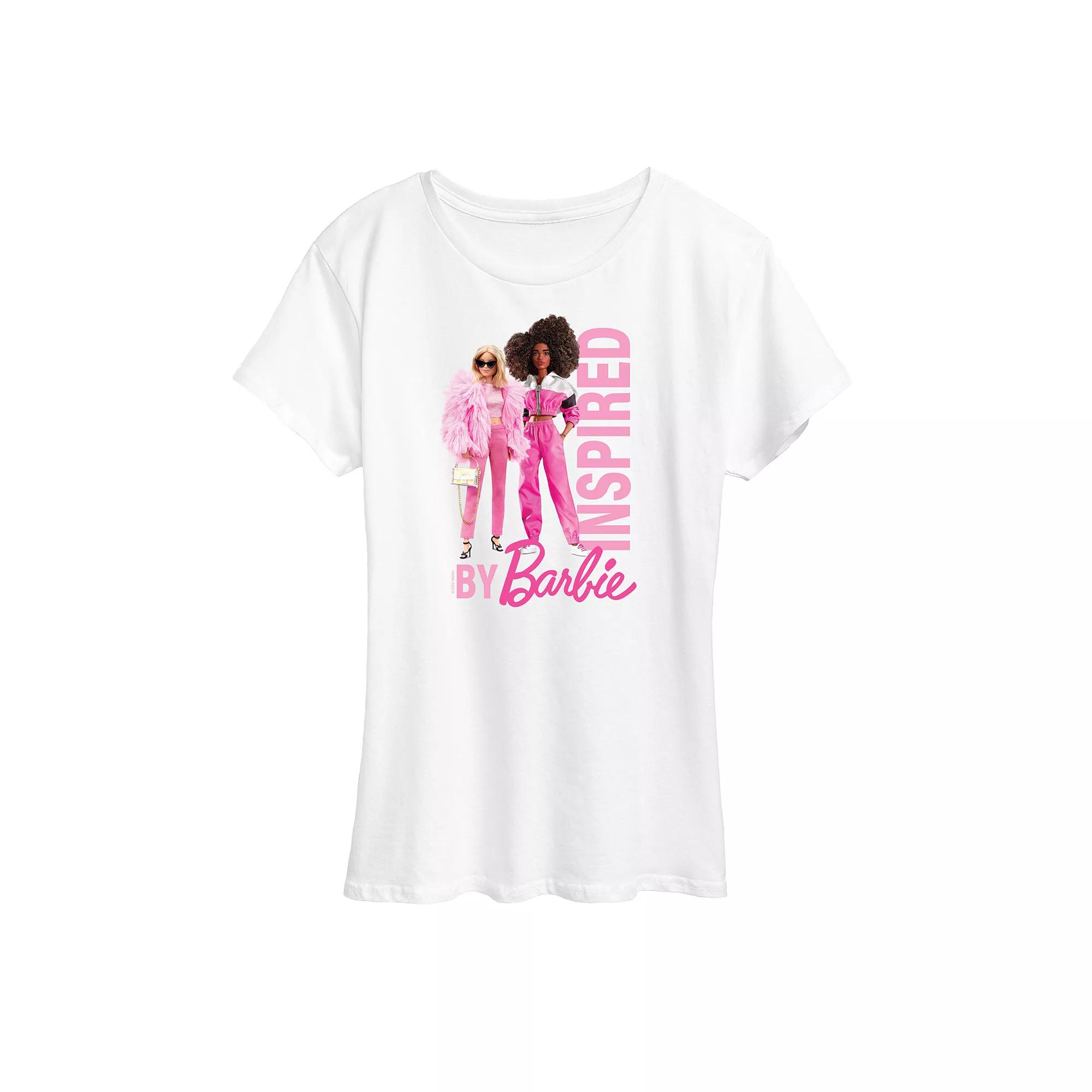 White & Pink Barbie Style Duo Inspired By Graphic Tee - Women & Plus. Give your casual picks a refresh with this cotton crewneck tee featuring a fun Barbie motif. Full graphic text: Inspired by Barbie.Size S: 26 long from high point of shoulder to hemSize & fit: Relaxed-fit garment with a slightly longer hem. Fits true to size.100% cottonMachine wash; tumble dryImported, screen printed in the USA