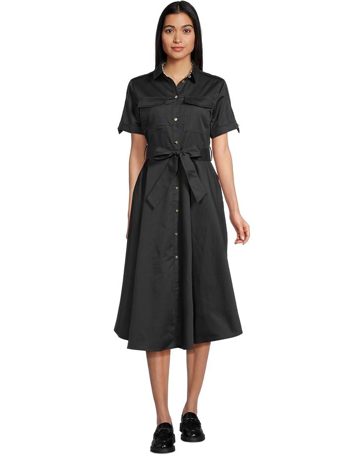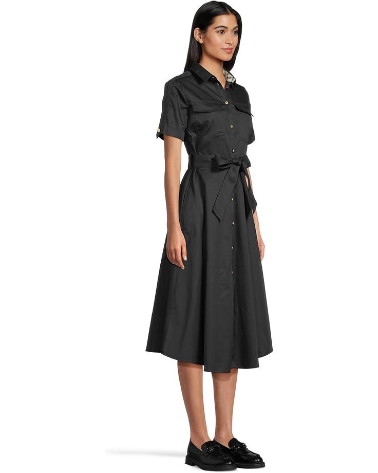 The Barbour® Barbour Ivy Midi Dress is a cotton sateen dress with epaulette detail and a self fabric belt. It features patch pockets to chest, side entry pockets, tartan back neck tape and gold shank buttoned front closure. This midi dress is styled with short sleeves, a collared neckline, and a slim ID bar at the back.