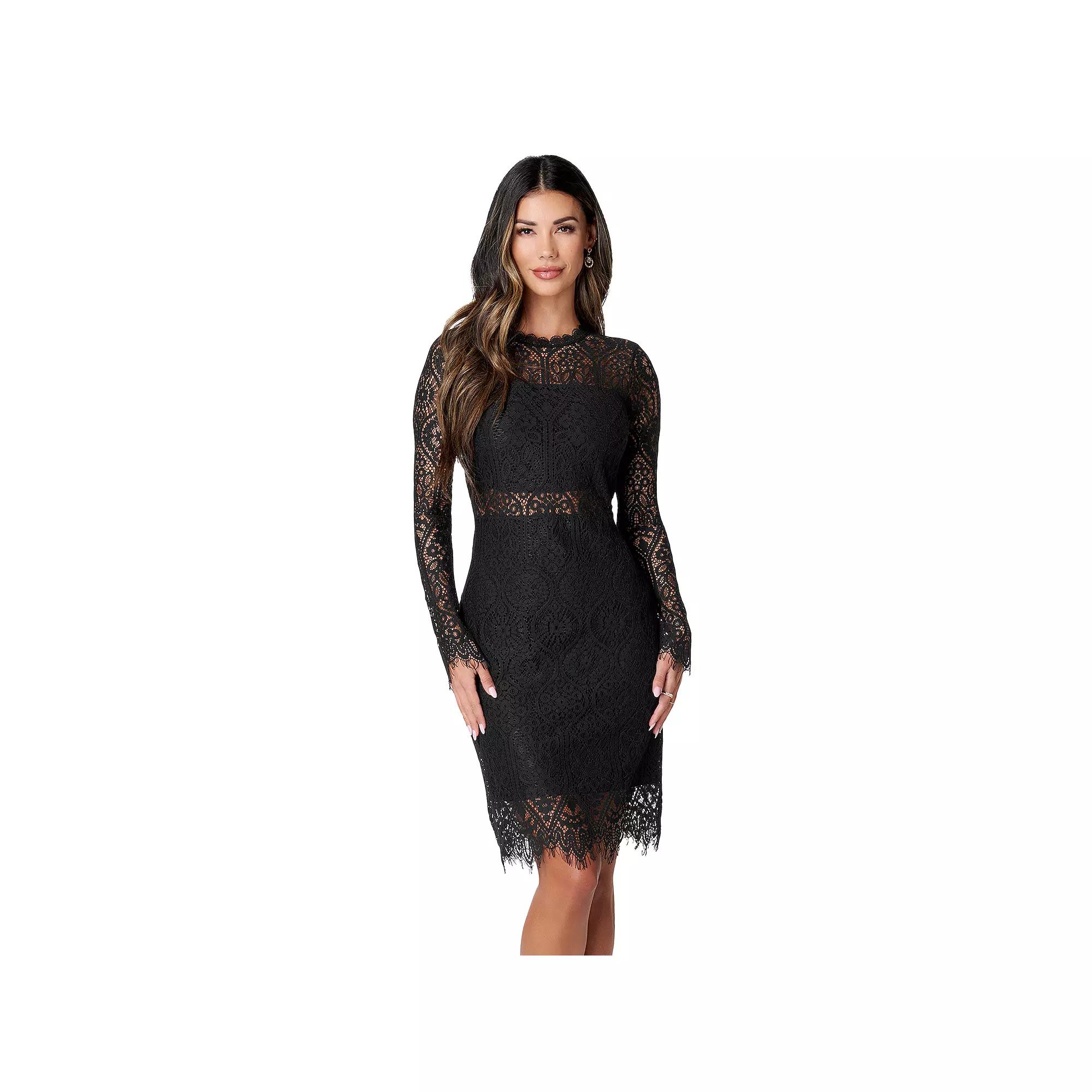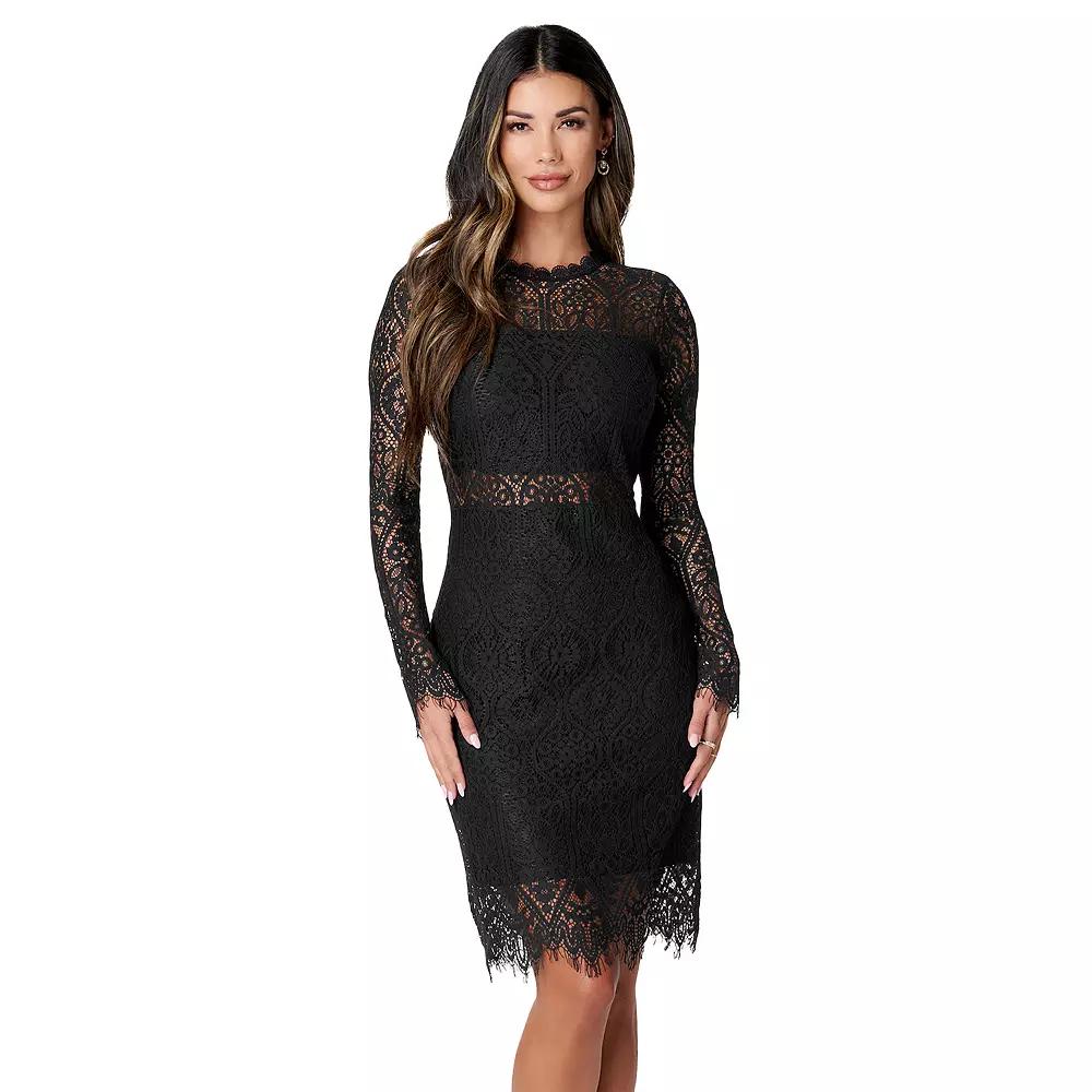 Elevate your evening wardrobe with this stunning creation from bebe, featuring intricate scallop lace that gracefully embraces your silhouette. Perfect for cocktail parties or romantic dinners, this dress effortlessly blends elegance and allure, making every movement a statement of sophistication. Click on this WOMEN'S GUIDE to find the perfect fit and more! - https://www.kohls.com/feature/womens-fit-guide.jsp. FIT & SIZE: Missy true fit, Bodycon styling, Maxi length hits at the ankle, 34-in. length, Straight hem. DETAILS: Zipper back, Illusion neckline, Long sleeves, Imported. MATERIAL & CARE: Lace construction, Polyamide, cotton, Hand wash and line dry. Size: Medium. Color: Black. Gender: female. Age Group: adult. Material: WOVEN.