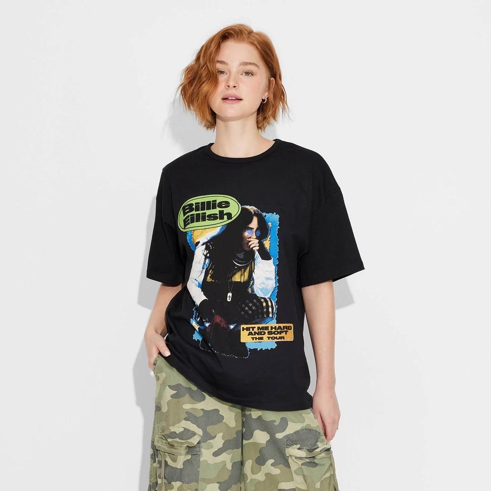 Enjoy laid-back style with the Womens Billie Eilish Tour Oversized Short Sleeve Graphic T-Shirt in Black. Made of soft, lightweight cotton, this oversized t-shirt offers a comfortable, relaxed fit and features a classic crewneck design. Falling below the hip, its a versatile pick for casual outings or lounging. The Billie Eilish graphics add a fun vibe to the overall outfit, making this t-shirt a great addition to your daily wardrobe.
