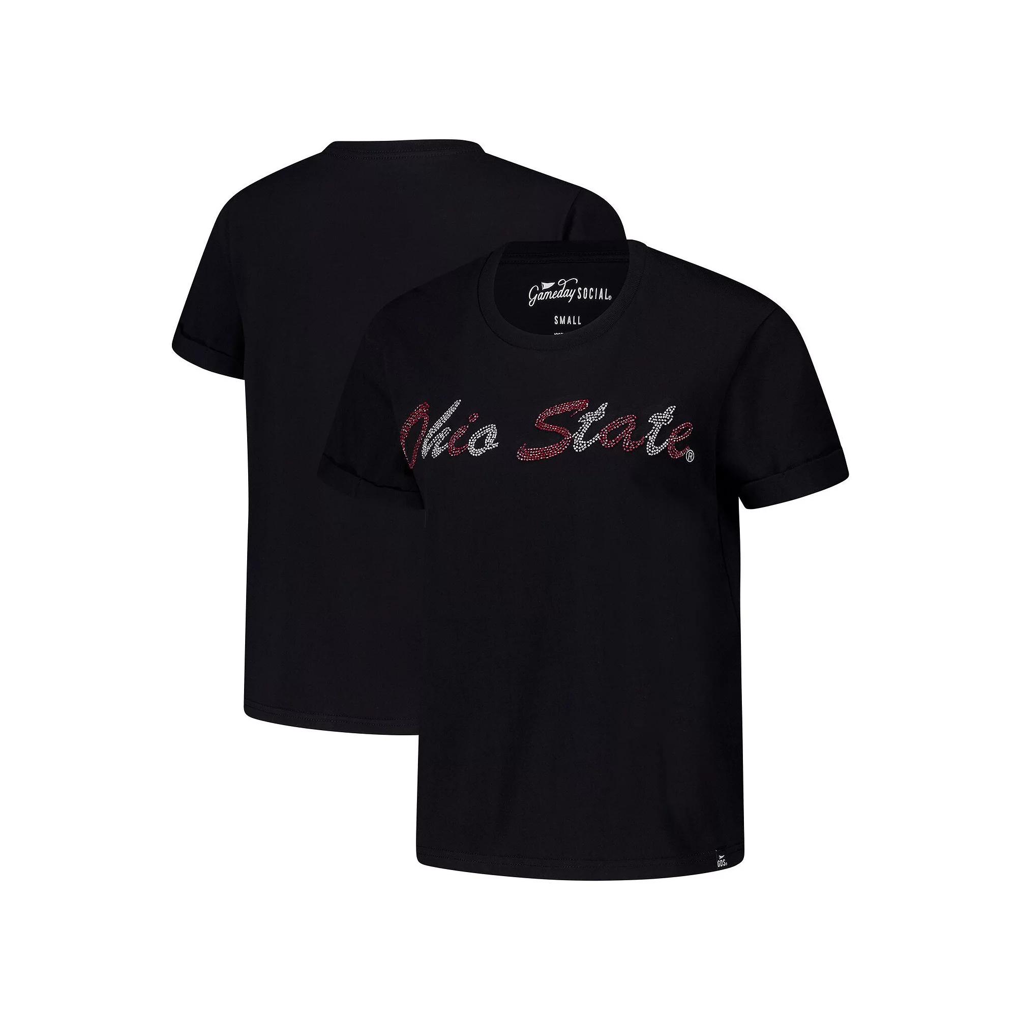 Add some glitz to your Ohio State Buckeyes game day attire with this Hand Sewn Beaded Script T-Shirt. This classic crew neck tee is incredibly comfortable for all-day wear, making it a perfect choice for game day or any casual outing. The hand-sewn beaded script graphics add a touch of elegance and elevate this tee, making it a unique and stylish way to show your Buckeye pride.Add some glitz to your Ohio State Buckeyes game day attire with this Hand Sewn Beaded Script T-Shirt. This classic crew neck tee is incredibly comfortable for all-day wear, making it a perfect choice for game day or any casual outing. The hand-sewn beaded script graphics add a touch of elegance and elevate this tee, making it a unique and stylish way to show your Buckeye pride.PRODUCT FEATURESImportedBrand: Gameday SocialHand-sewn beaded scriptgraphicsOfficially licensedMaterial: 100% CottonHand wash, dry flatShort sleeveCrew neck provides a traditional look and is comfortable to wear all day Color: Black. Gender: female. Age Group: adult.