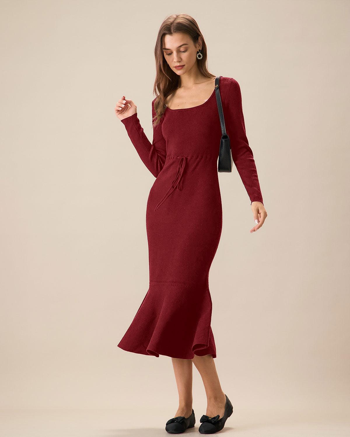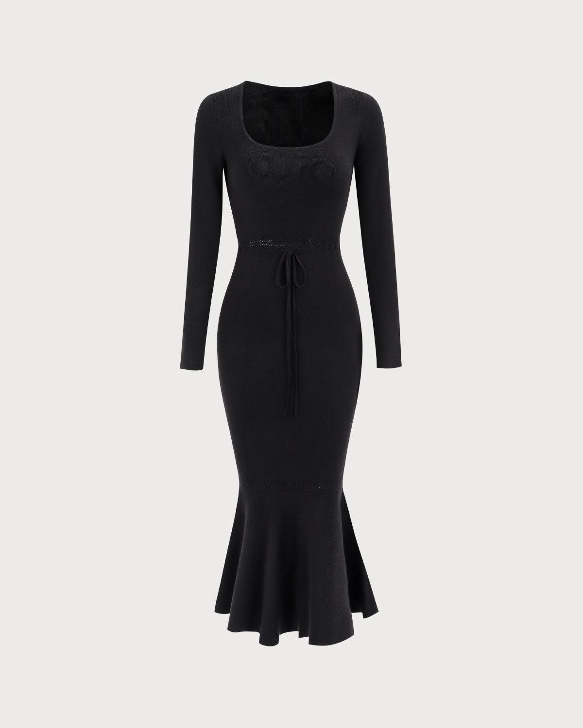 Fabric:This Sweater Maxi Dress is made of Viscose and Nylon. Viscose (aka rayon) is a man-made cellulosic fiber made from wood pulp. It's soft, breathable, durable, and moisture-wicking. Nylon is a flexible synthetic fiber, waterproof, and can take rubbing and scraping without wearing away. Description:Featuring a square neckline and a flattering mermaid silhouette, this dress hugs the body in soft knit fabric. Perfect for both formal and casual settings, it offers an elegant look with effortless style. Details:- Occasion: Daily- Fabric Stretch: Medium Stretch- Embellishment: Cut Out, Tie- Silhouette: Mermaid- Fabric: Viscose 72.0%, Nylon 28.0%