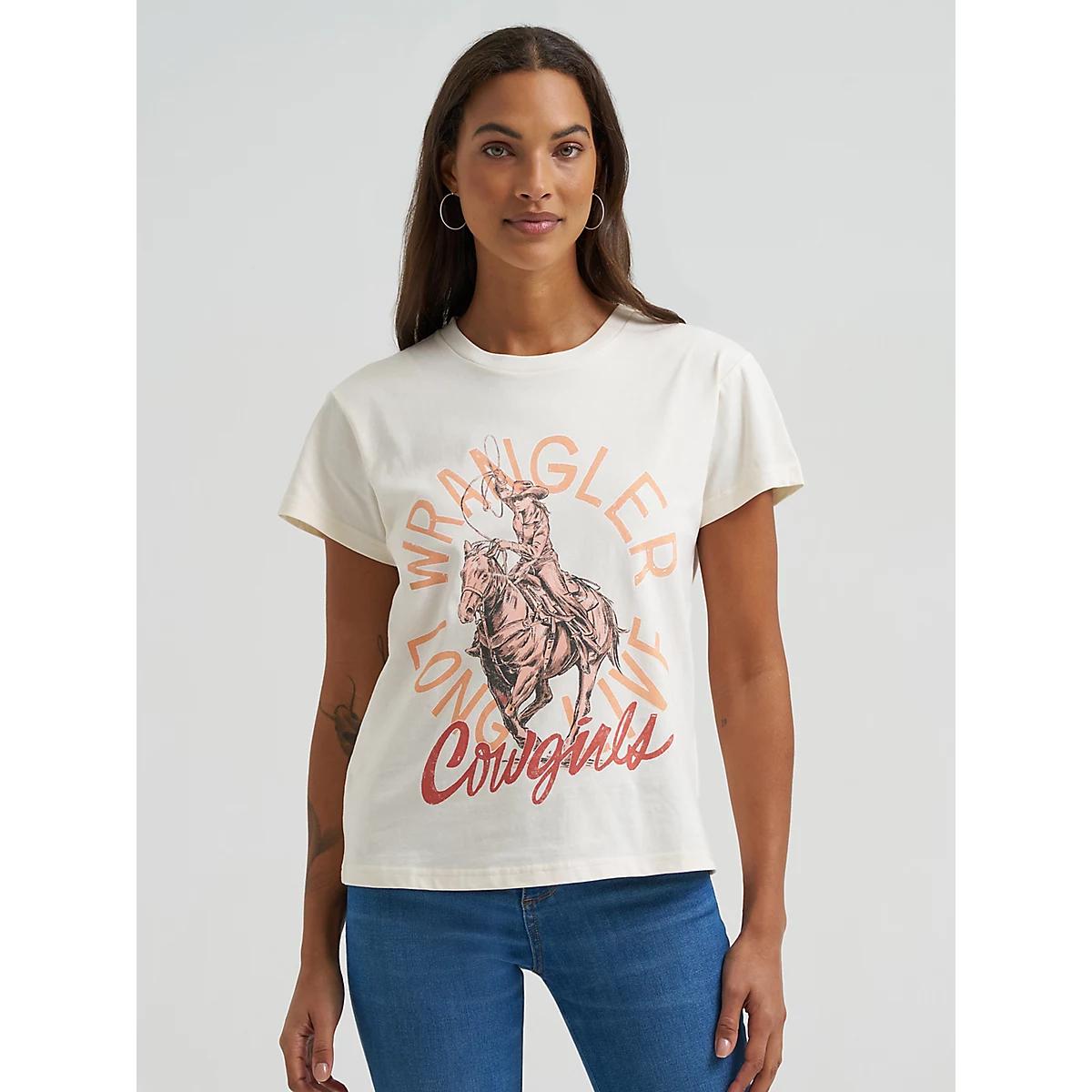 This Faded Cowgirl Tee captures the cowgirl spirit with a pre-faded look and feel, featuring a graphic of a galloping cowgirl, complete with our iconic logo and “Long Live Cowgirls” in retro-inspired lettering. It’s cut with a straight silhouette, a non-fitted waist, capped sleeves, and dropped shoulders. Nothing goes better with your Wrangler® denim than a classic crewneck.