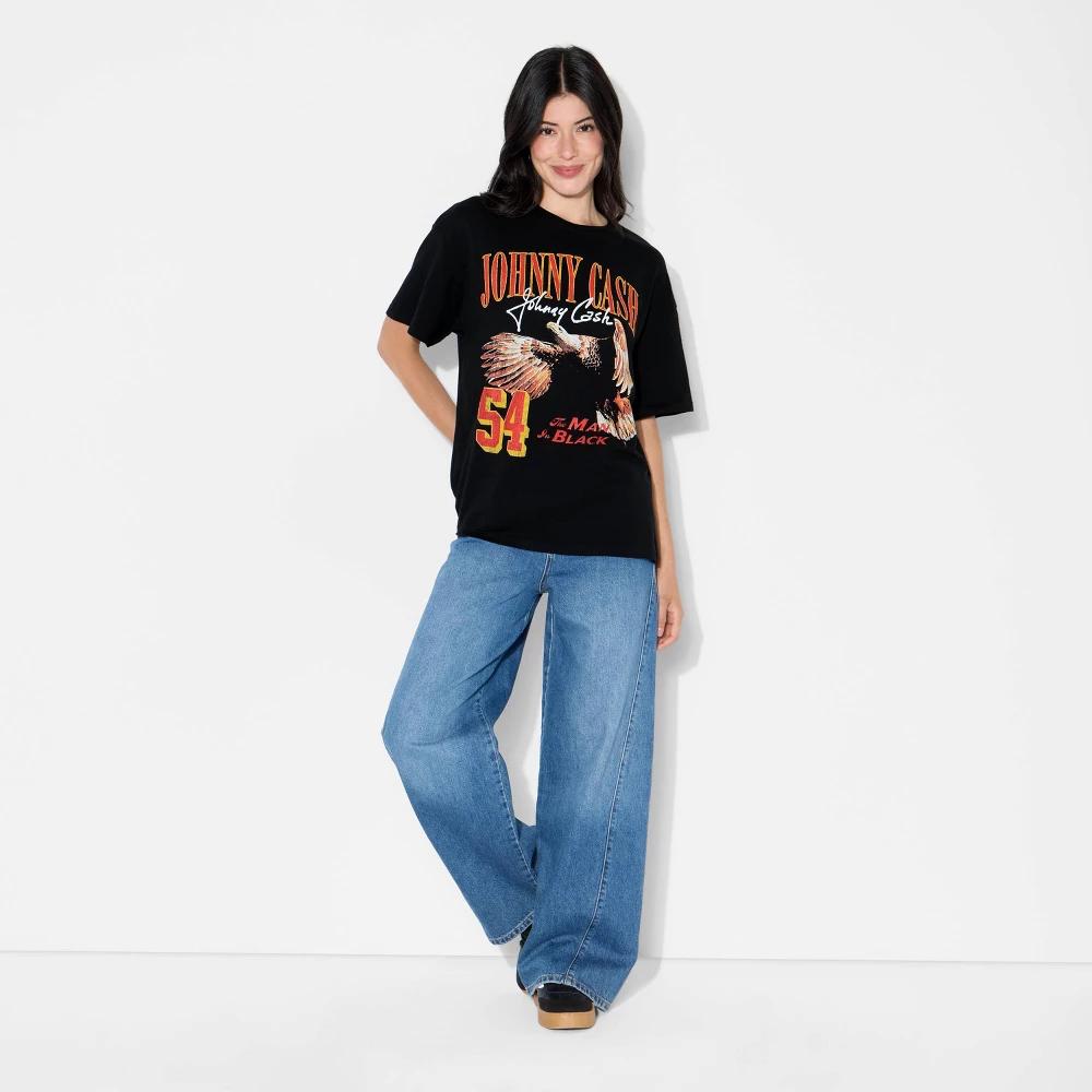 This Women’s Cash Ring of Fire oversized short sleeve graphic t-shirt in black is a comfy and casual pick with a bold touch. It features a fun “Cash Ring of Fire” design on the front that adds a bit of edge to your everyday look. Made from lightweight knit cotton material, it feels soft and breathable. The short sleeves and pullover style keep it simple and easy to wear. Great for pairing with jeans, shorts, or just lounging around.