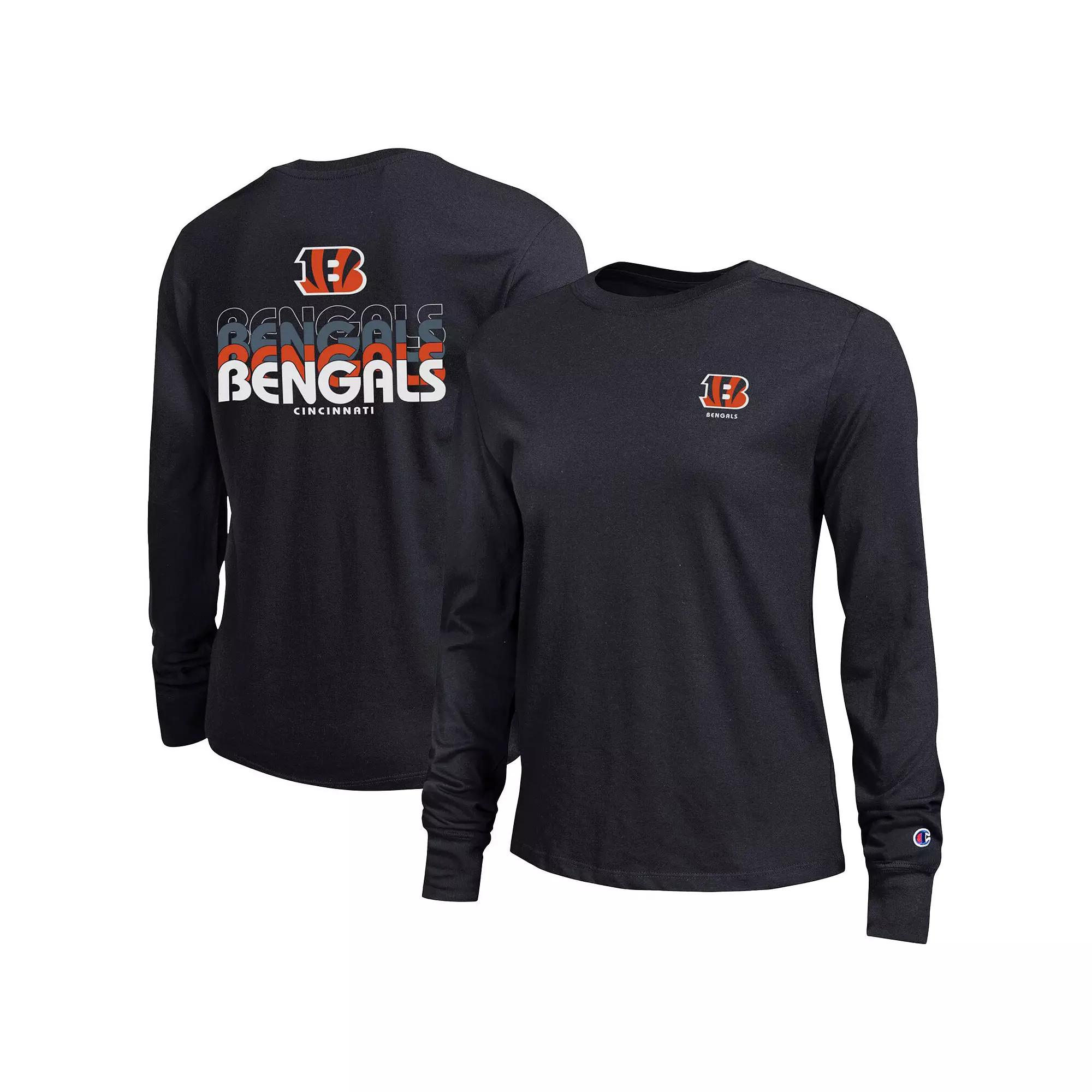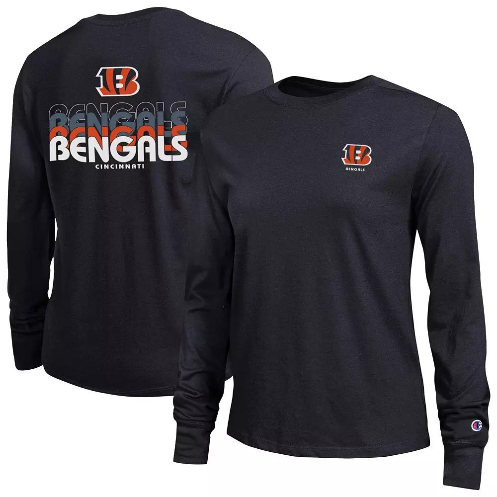 Show off your unwavering team pride with this Cincinnati Bengals Core Long-Sleeve T-Shirt from Champion. The relaxed fit ensures a loose and roomy feel across the chest, shoulders, and body, making it ideal for all-day wear. The team logo printed at the left chest and the team graphic on the back proudly display your Cincinnati Bengals pride. Brand: Champion. Crew neck. Long sleeve. Relaxed Fit: Loose and roomy across the chest, shoulders and body. Material: 60% Cotton/40% Polyester. Hip length (Measures approx. 24). Screen print graphics. Tagless collar with interior taping for a more comfortable feel. Rib knit cuffs for a snug fit and durable stretch. Officially licensed. Team logo printed at left chest with team graphic printed on back. Machine wash, tumble dry low. Imported. Color: Black. Gender: female. Age Group: adult.