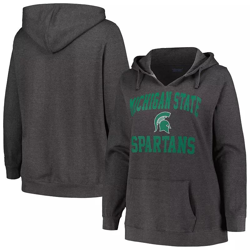 Layer up with a bold display of enthusiasm for the Michigan State Spartans by adding this Heart & Soul pullover hoodie from Champion. It features bold Michigan State Spartans graphics across the chest just below the notched neck for a distinct look. The integrated fleece lining gives this midweight hoodie an added element of coziness that makes it a strong choice for cooler days ahead.Layer up with a bold display of enthusiasm for the Michigan State Spartans by adding this Heart & Soul pullover hoodie from Champion. It features bold Michigan State Spartans graphics across the chest just below the notched neck for a distinct look. The integrated fleece lining gives this midweight hoodie an added element of coziness that makes it a strong choice for cooler days ahead.PRODUCT FEATURESLong sleevePulloverFront pouch pocketFleece liningMaterial: 60% Cotton/40% PolyesterMidweight hoodie suitable for moderate temperaturesHoodedOfficially licensedBrand: ChampionNotch neckMachine wash, tumble dry lowScreen print graphicsImported Size: 2X. Color: Charcoal. Gender: female. Age Group: adult.