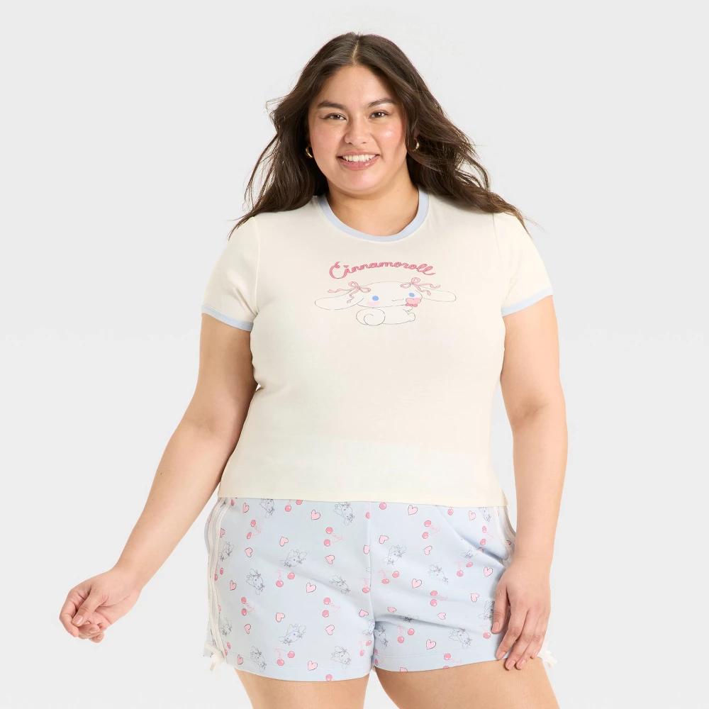 The Womens Cinnamoroll Short Sleeve Graphic Baby T-Shirt in Ivory is a fun and vibrant choice for casual wear. Featuring a playful cinnamoroll print on the front, this t-shirt adds a touch of whimsy to your outfit. Made from a blend of lightweight jersey fabric, it feels soft and comfortable, perfect for everyday wear. The short sleeve and pullover style make it easy to slip on, while the baby tee fit offers a snug and stylish look. Pair it with jeans or shorts for a relaxed and cheerful ensemble.
