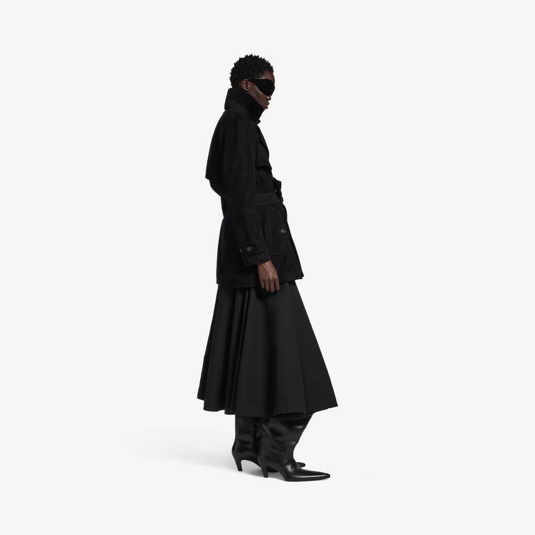 Cocoon Short Trench in black vintage looking suede for WomenGarde-Robe is made up of wardrobe staples in elevated cuts, sharp finishing, and luxe materials without any branding other than bold silhouettes and precise tailoring with minimalist construction techniques.
