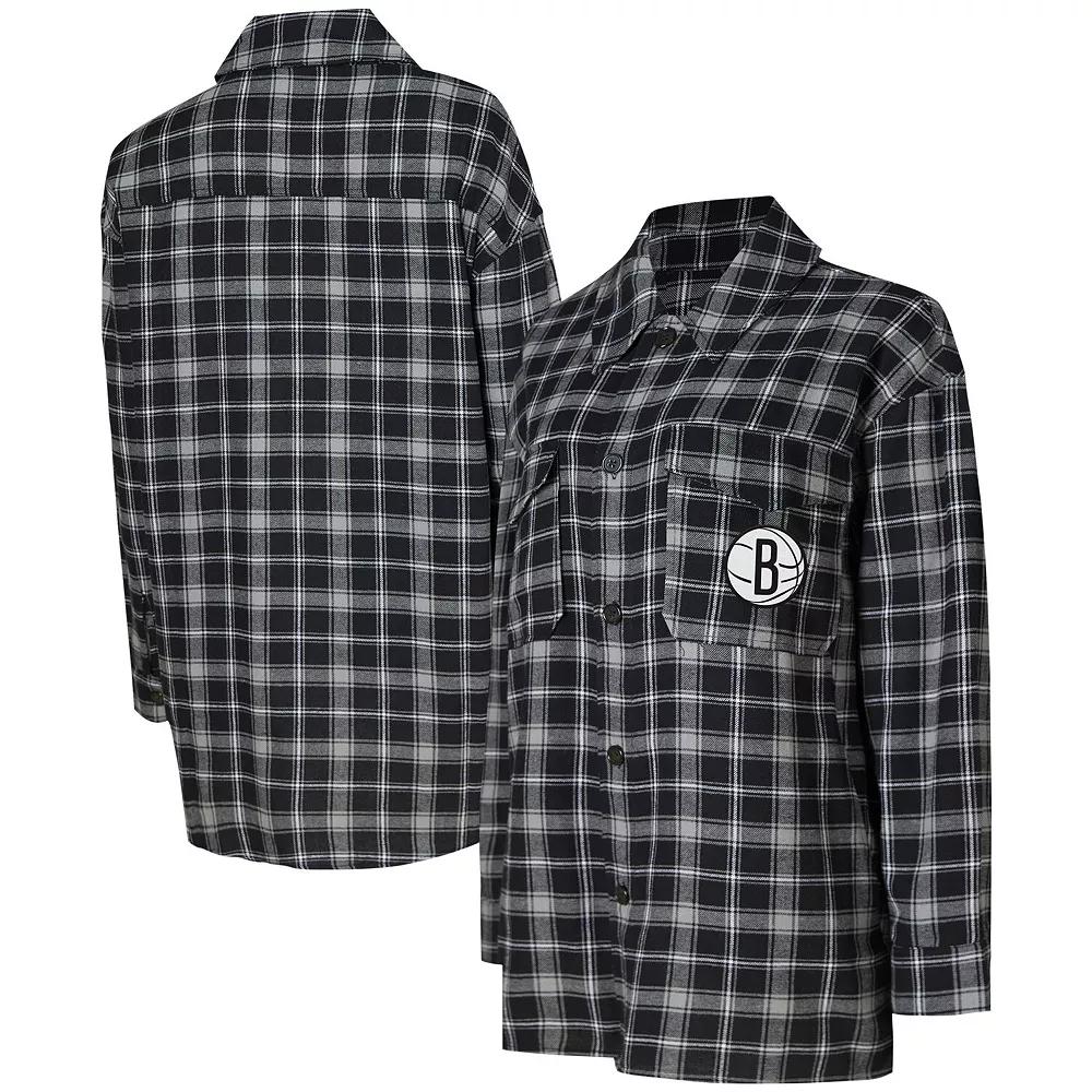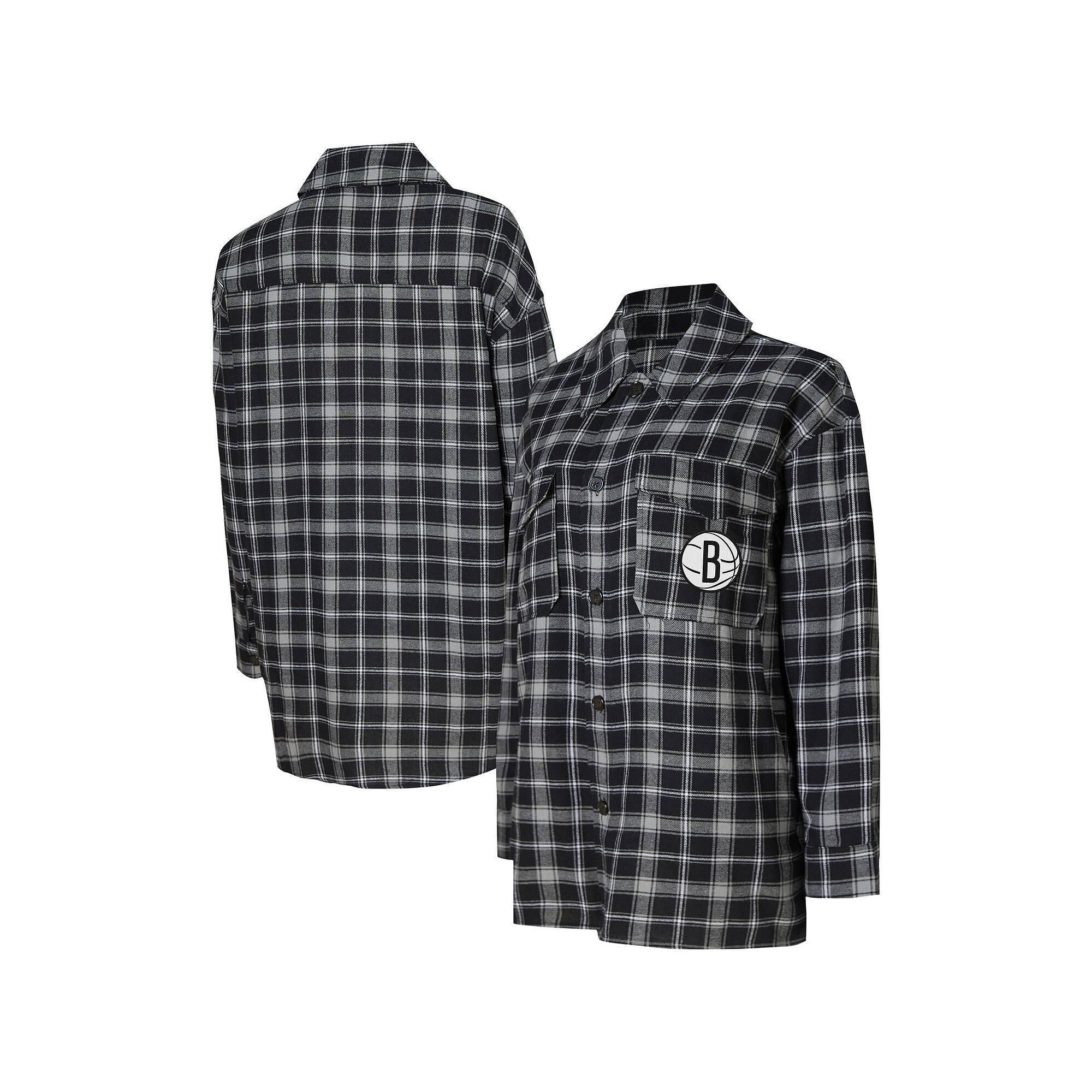 Enjoy a bold showing of Brooklyn Nets spirit in the form of this Boyfriend Nightshirt from College Concepts. It features an instantly recognizable Brooklyn Nets graphic embroidered below the left chest pocket and a team-colored flannel pattern for added flair. The dual chest pockets offer convenient, small-item storage, while the full-button front makes for the ultimate layered look before heading to bed.Enjoy a bold showing of Brooklyn Nets spirit in the form of this Boyfriend Nightshirt from College Concepts. It features an instantly recognizable Brooklyn Nets graphic embroidered below the left chest pocket and a team-colored flannel pattern for added flair. The dual chest pockets offer convenient, small-item storage, while the full-button front makes for the ultimate layered look before heading to bed.Full-button frontTwo chest pockets with flapsMachine wash, tumble dry lowOne-button cuffsRounded hemOutseam on size M measures approx. 18Officially licensedLong sleeveBrand: College ConceptsMaterial: 60% Cotton/40% PolyesterTwo front slip pocketsWoven plaid patternImportedEmbroidered graphics Color: Black. Gender: female. Age Group: adult.