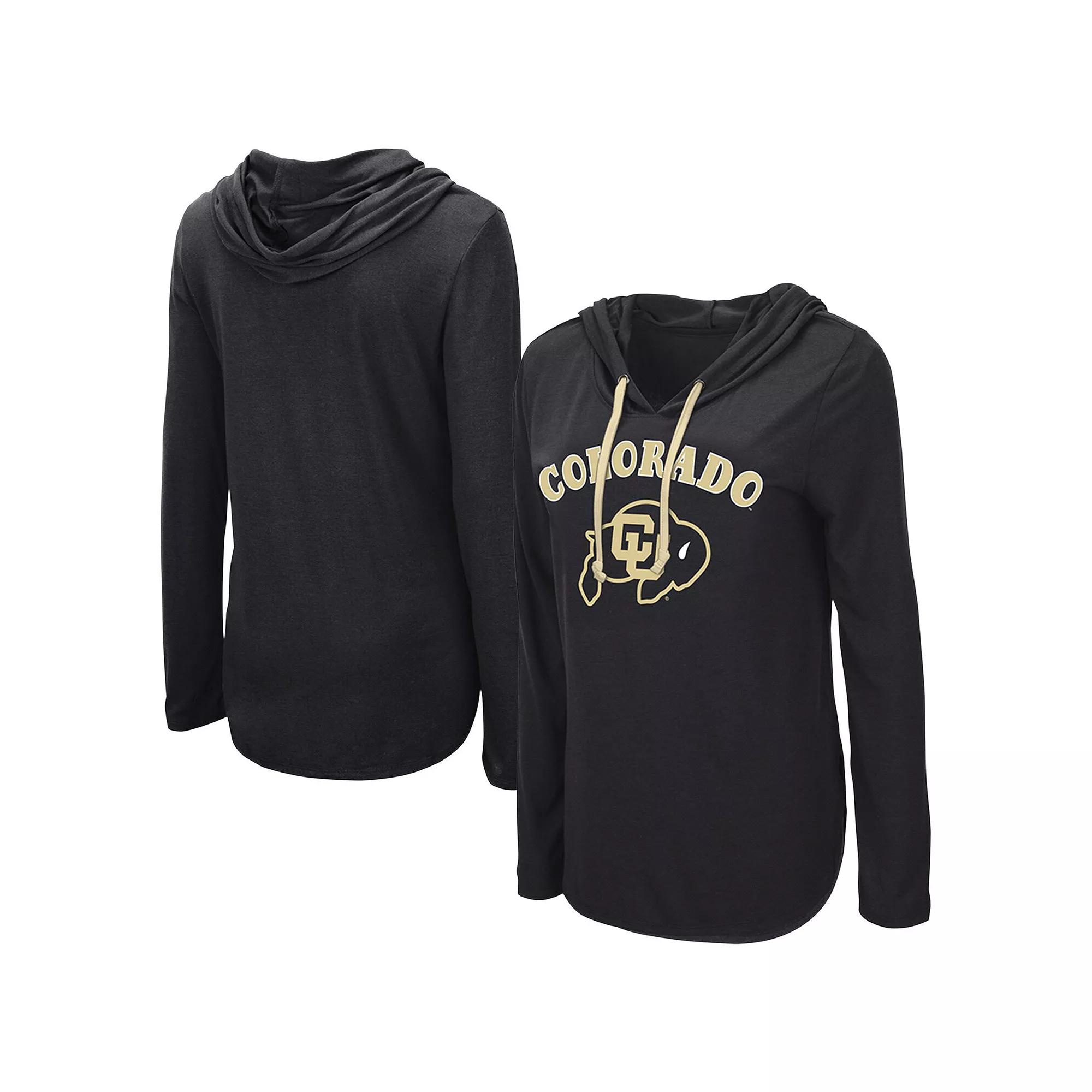 Stay comfortable while cheering on your Colorado Buffaloes in this Colosseum Long Sleeve Hoodie T-Shirt. The lightweight design is perfect for layering or wearing on its own. Screen-printed Colorado Buffaloes graphics on the chest and back hem let everyone know where your collegiate loyalty lies. Hooded. Officially licensed. Screen print graphics. Imported. Long sleeve. Machine wash, tumble dry low. Lightweight feel. Material: 65% Polyester/35% Rayon. Sizing Tip: Product runs small. We recommend ordering one size larger than you normally wear. Brand: Colosseum. Rounded hem. Color: Black. Gender: female. Age Group: adult. Material: COTTON.