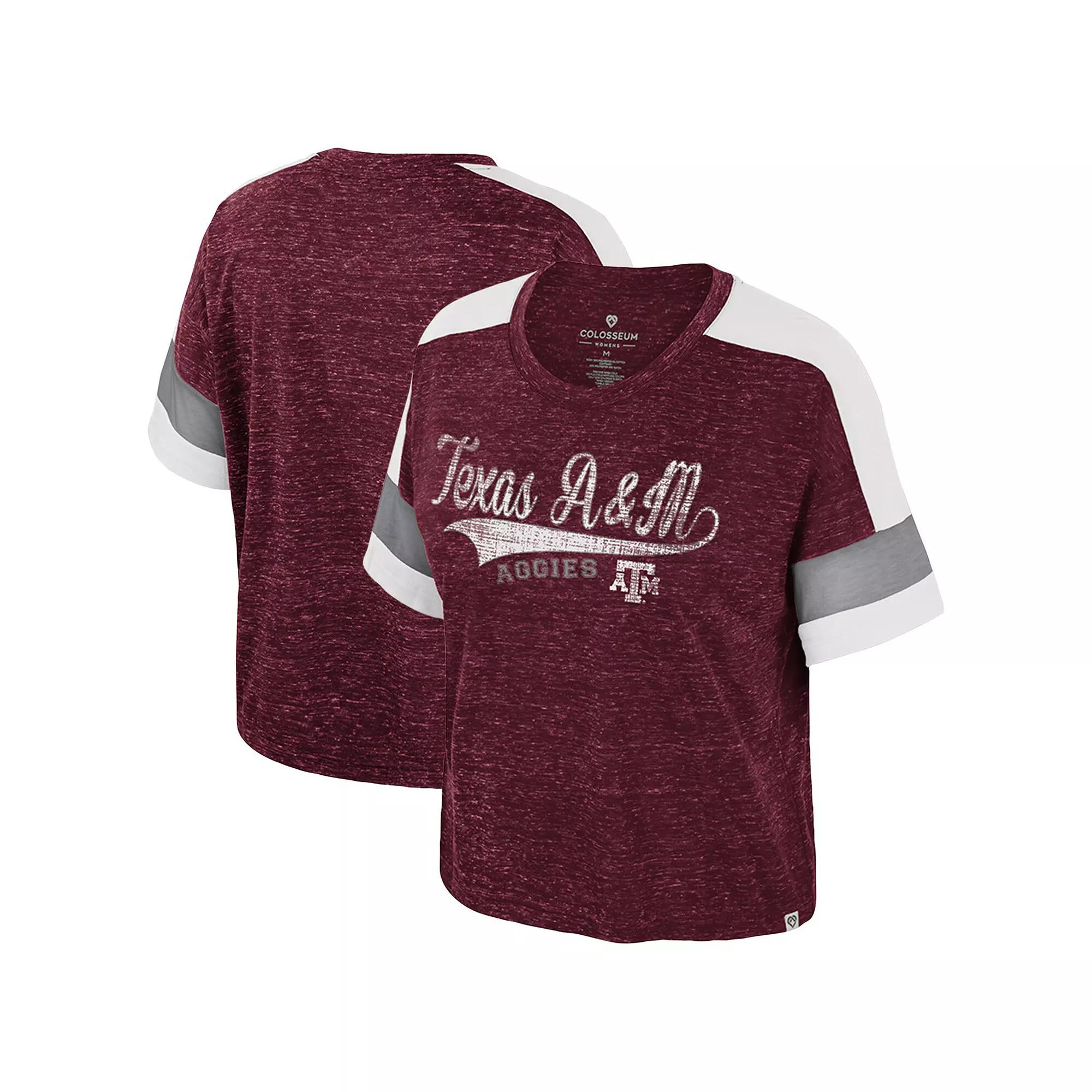 Bring bold Texas A&M Aggies spirit to your game day look with the Colosseum Ruth Color Block Scoop Neck T-Shirt. This stylish tee features a unique color block design and distressed details that create a vintage-inspired aesthetic. The horizontal stylized team wordmark printed across the chest proudly showcases your Texas A&M Aggies spirit.Bring bold Texas A&M Aggies spirit to your game day look with the Colosseum Ruth Color Block Scoop Neck T-Shirt. This stylish tee features a unique color block design and distressed details that create a vintage-inspired aesthetic. The horizontal stylized team wordmark printed across the chest proudly showcases your Texas A&M Aggies spirit.PRODUCT FEATURESShort sleeveSlub fabricImportedOfficially licensedScoop neckMaterial: 95% Polyester/5% Cotton - Body; 65% Polyester/35% Rayon - ContrastLoose fitMachine wash, tumble dry lowBrand: ColosseumDistressed details for a vintage lookSewn-in, contrast color stripes on sleevesHorizontal stylized team wordmark printed across the chest Gender: female. Age Group: adult.