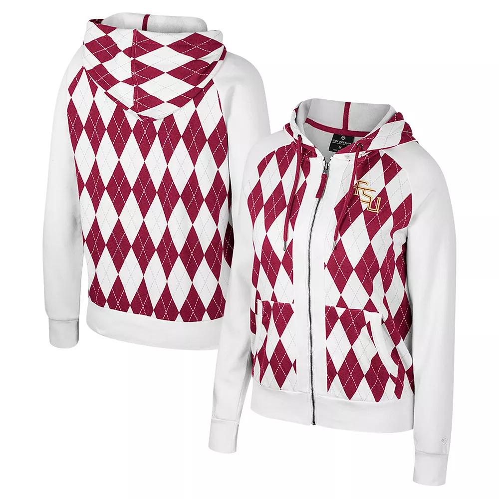 Stay warm and stylish while cheering on the Florida State Seminoles with The Dealio Argyle Full-Zip Jacket from Colosseum. This full-zip jacket features an eye-catching argyle design on the bodice and hood, making it a stylish addition to any Florida State Seminoles fan's wardrobe. Plus, its midweight construction and adjustable hood offer optimal comfort and warmth for those chilly game days.Stay warm and stylish while cheering on the Florida State Seminoles with The Dealio Argyle Full-Zip Jacket from Colosseum. This full-zip jacket features an eye-catching argyle design on the bodice and hood, making it a stylish addition to any Florida State Seminoles fan's wardrobe. Plus, its midweight construction and adjustable hood offer optimal comfort and warmth for those chilly game days.PRODUCT FEATURESFull ZipOfficially licensedLong sleeveEmbroidered graphics at left chestMachine wash, tumble dry lowBrand: ColosseumMidweight hoodie suitable for moderate temperaturesTwo front pockets for warming hands or holding small itemsAdjustable hood for extra protection from the coldImportedRaglan sleeves for greater freedom of movement in the shoulders and armsArgyle design on bodice and hoodMaterial: 80% Cotton/20% Polyester Size: XL. Color: White. Gender: female. Age Group: adult.