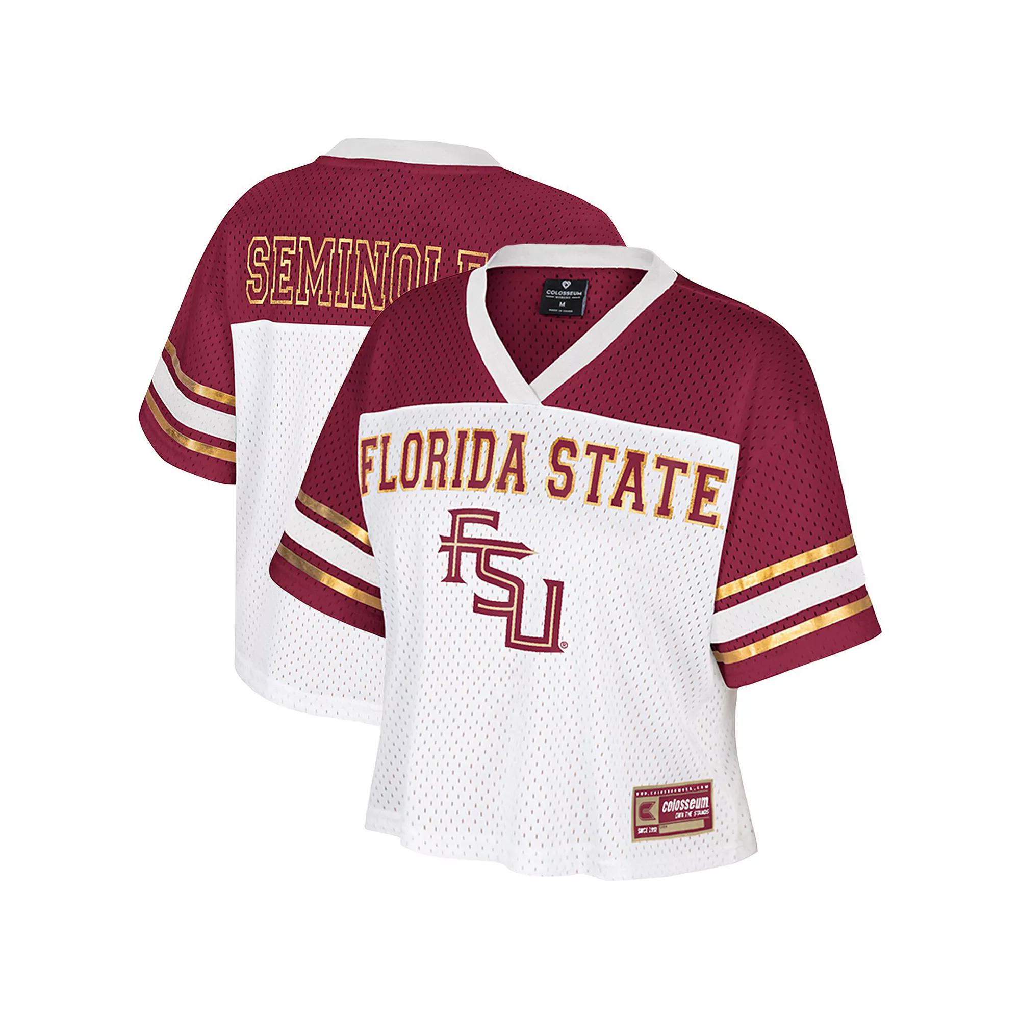 Channel your Florida State Seminoles spirit with a touch of sporty style in this Colosseum Treasure Cropped Football Jersey. The mesh fabric provides a breathable and lightweight feel, perfect for staying cool and comfortable during warm-weather game days. With its cropped design and contrast-color details, this jersey offers a stylish and modern twist on traditional fanwear.Channel your Florida State Seminoles spirit with a touch of sporty style in this Colosseum Treasure Cropped Football Jersey. The mesh fabric provides a breathable and lightweight feel, perfect for staying cool and comfortable during warm-weather game days. With its cropped design and contrast-color details, this jersey offers a stylish and modern twist on traditional fanwear.PRODUCT FEATURESOfficially licensedShort sleeveMachine washMaterial: 100% PolyesterContrast-color yoke and sleevesV-neckCropped design hits at hipImportedFoil screen print team name and logo on center chest and backMesh fabricBrand: ColosseumRaglan contrast-color sleeves Color: White. Gender: female. Age Group: adult. Material: Cotton.