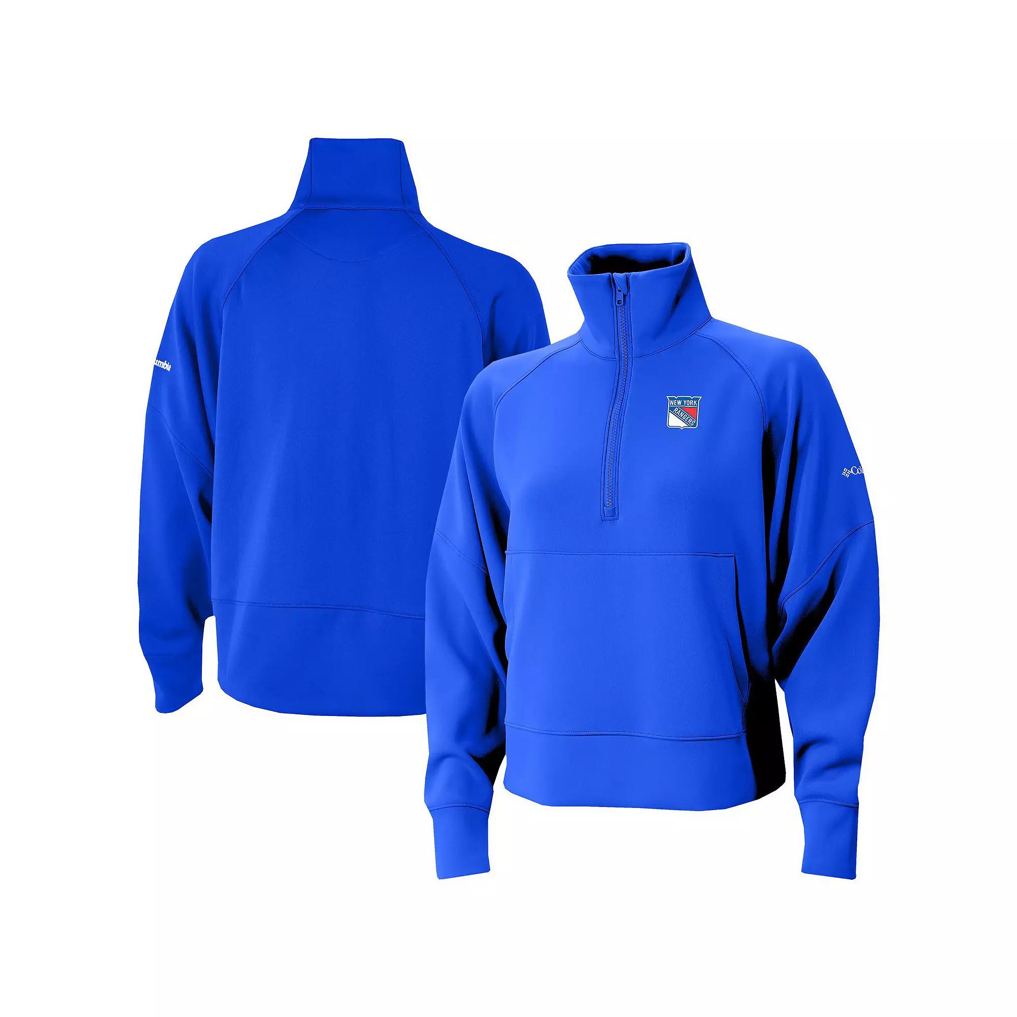 Add a layer of warmth and style to your New York Rangers fan gear with this Wickhams Hills Raglan Omni-Wick Half-Zip Pullover from Columbia. The lightweight material and loose fit keep you comfortable whether you're at the big game or heading out to run errands. Plus, the heat-sealed graphics let everyone know you are a proud New York Rangers fan. Brand: Columbia. Cuffs with thumbholes. Machine wash, tumble dry low. Mock neck with zipper garage. Omni-Shade UPF 30 guards against skin damage using tight fabric construction and modified fibers to block UVA/UVB rays, so you stay protected in the sun. Omni-Wick pulls moisture away from the body and enables perspiration to evaporate quickly, keeping you dry and comfortable. Raglan sleeves and dropped shoulders for greater freedom of movement in the shoulders and arms. 1/2-Zip. Officially licensed. Loose fit provides ample room for movement and airflow. Embroidered logo at left chest. Long sleeve. High hip length (Measures approx. 22). Front pouch pocket. Imported. Material: 90% Polyester/10% Spandex. Lightweight pullover suitable for mild temperatures. Size: 2X. Color: Ran Blue. Gender: female. Age Group: adult. Material: COTTON.