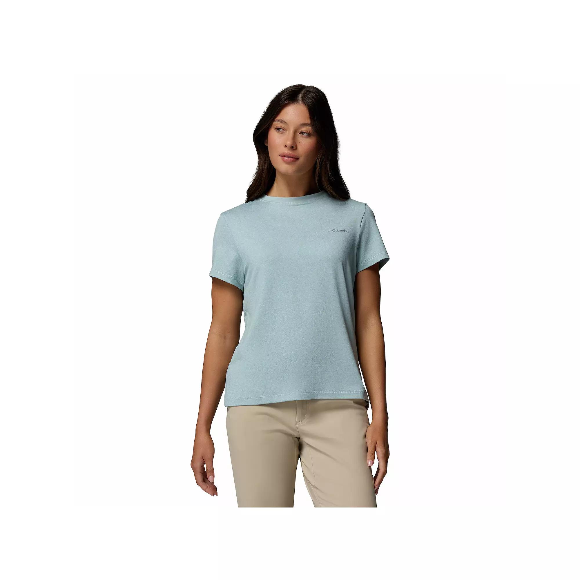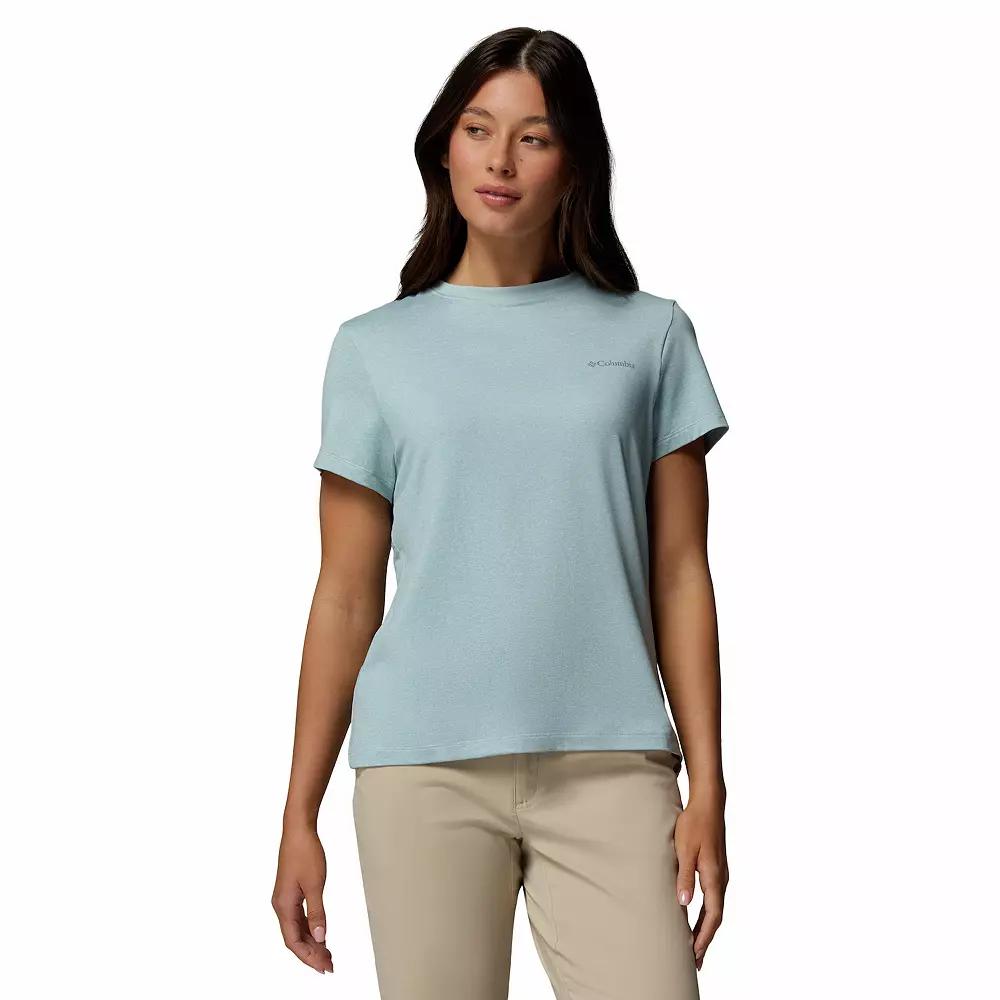 Stay cool and protected under the sun with this Columbia tee, designed to keep you feeling fresh whether you're exploring the great outdoors or just lounging in the backyard. Made with a comfy ribbed collar and breathable fabric, it's the perfect companion for all your sunny adventures, ensuring you look great while you soak up those rays. Click on this WOMEN'S GUIDE to find the perfect fit and more! - https://www.kohls.com/feature/womens-fit-guide.jsp. FEATURES: Knit construction for enhanced comfort, Omni-SHADE™ UPF 50 sun protection, Omni-WICK™ technology for moisture management. FIT & SIZE: Active fit, 24-in. length from shoulder to hem. MATERIAL & CARE: Body: 78% recycled polyester, 16% polyester, 6% elastane, Care: Machine wash. DETAILS: No closure - pullover styling, Crewneck, Short sleeves, Imported. Size: Large. Color: Marine Light Heather. Gender: female. Age Group: adult.
