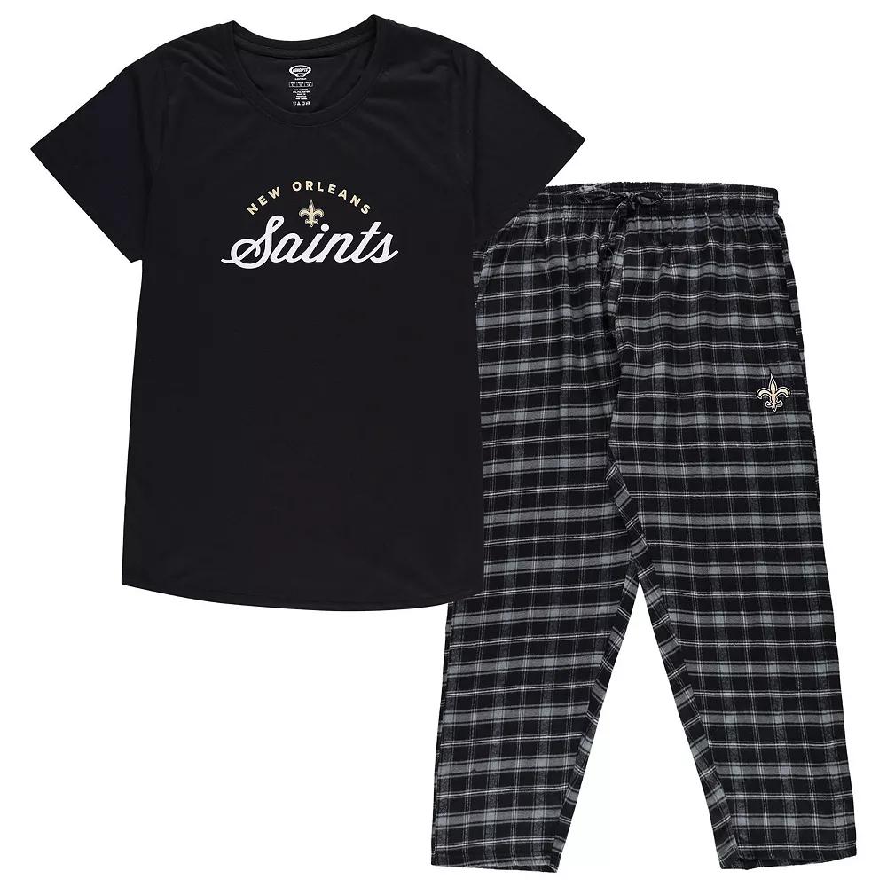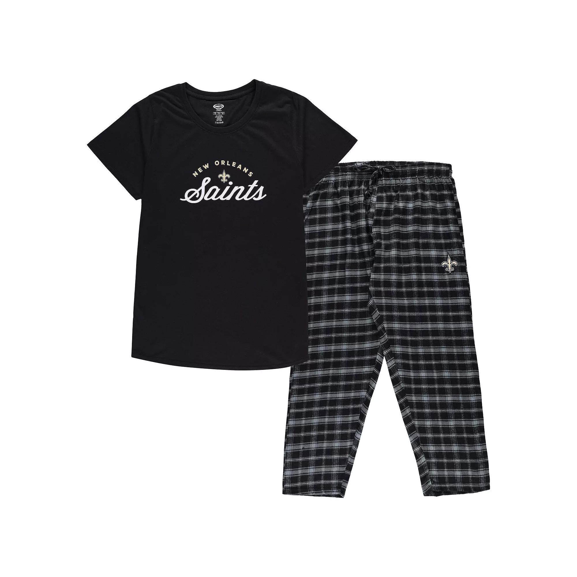 Dream of sweet New Orleans Saints victories in this comfy Badge sleep set from Concepts Sport. Its solid T-shirt has New Orleans Saints graphics printed on jersey fabric, and the flannel pants feature the team logo embroidered on a coordinating plaid pattern. An adjustable waistband lets you customize the fit for the most comfortable feel.Dream of sweet New Orleans Saints victories in this comfy Badge sleep set from Concepts Sport. Its solid T-shirt has New Orleans Saints graphics printed on jersey fabric, and the flannel pants feature the team logo embroidered on a coordinating plaid pattern. An adjustable waistband lets you customize the fit for the most comfortable feel.PRODUCT FEATURESShort sleeveMaterial: 60% Cotton/40% PolyesterOfficially licensedMachine wash, tumble dry lowElastic waistband with drawstringImportedWoven plaid pattern pantEmbroidered graphicsInseam on size 1X pant measures approx. 30Set includes T-shirt and one pair of pantsScreen print graphicsBrand: Concepts SportCrew neck Color: Black. Gender: female. Age Group: adult.