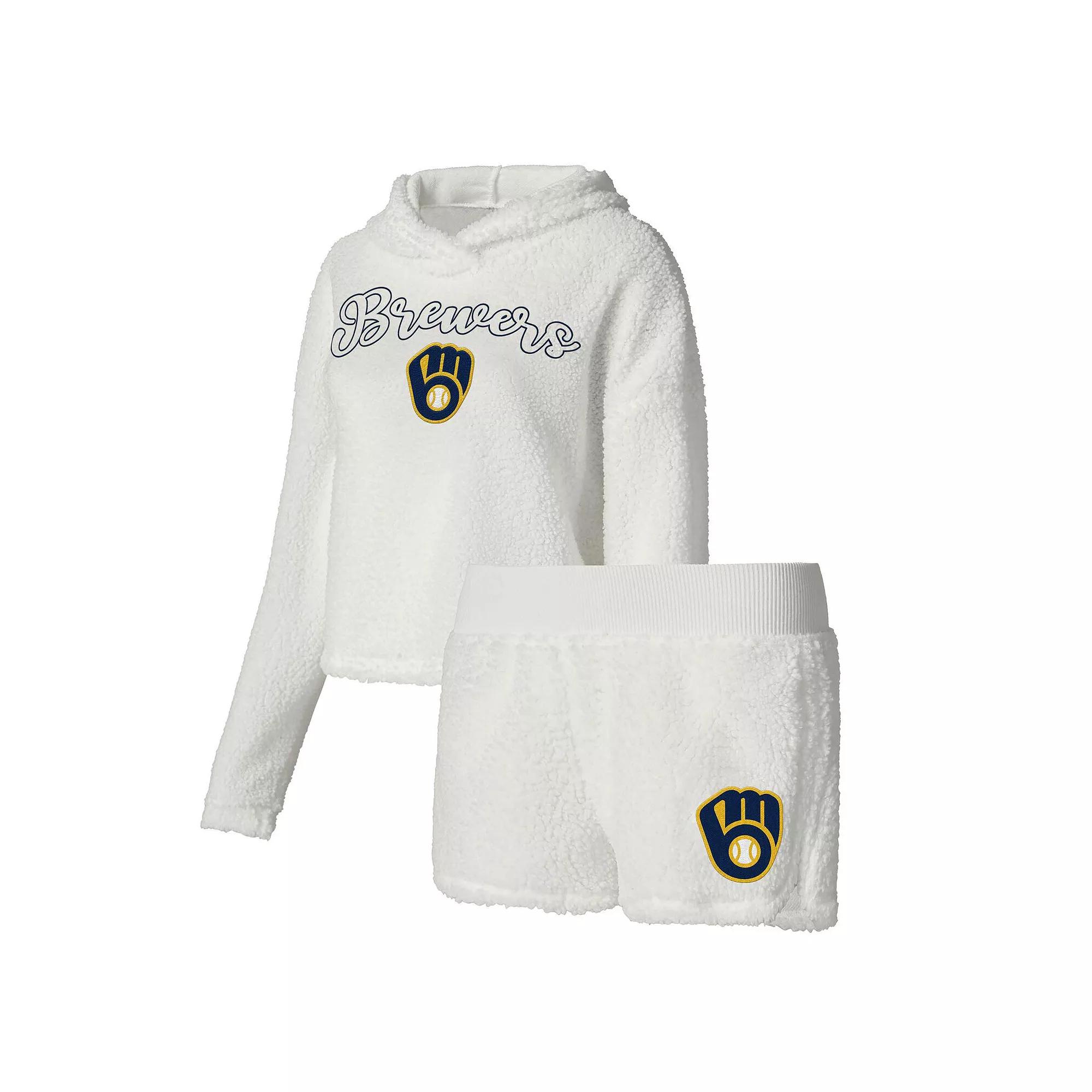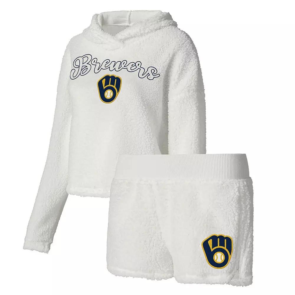 Head off to bed with unshakable Milwaukee Brewers spirits and in total comfort with this Fluffy hoodie and shorts sleep set from Concepts Sport. The cozy Sherpa fabric on the complementary top and bottoms adds the right amount of warmth to leave you dreaming of big Milwaukee Brewers wins. The printed graphics on both pieces leave no doubt about your enthusiasm, so youll wake up ready to root for your MLB squad. Elastic waistband on shorts Officially licensed Machine wash, tumble dry low Long sleeve Material: 100% Polyester - Body; 92% Polyester/8% Spandex - Trim Fabric Inseam on size M measures approx. 2.5 Lightweight hoodie suitable for mild temperatures Inseam on size S measures approx. 2.5 Droptail hem with side splits Imported Brand: Concepts Sport Sherpa fabric Set includes: Long sleeve hoodie T-shirt and Shorts Embroidered graphics
