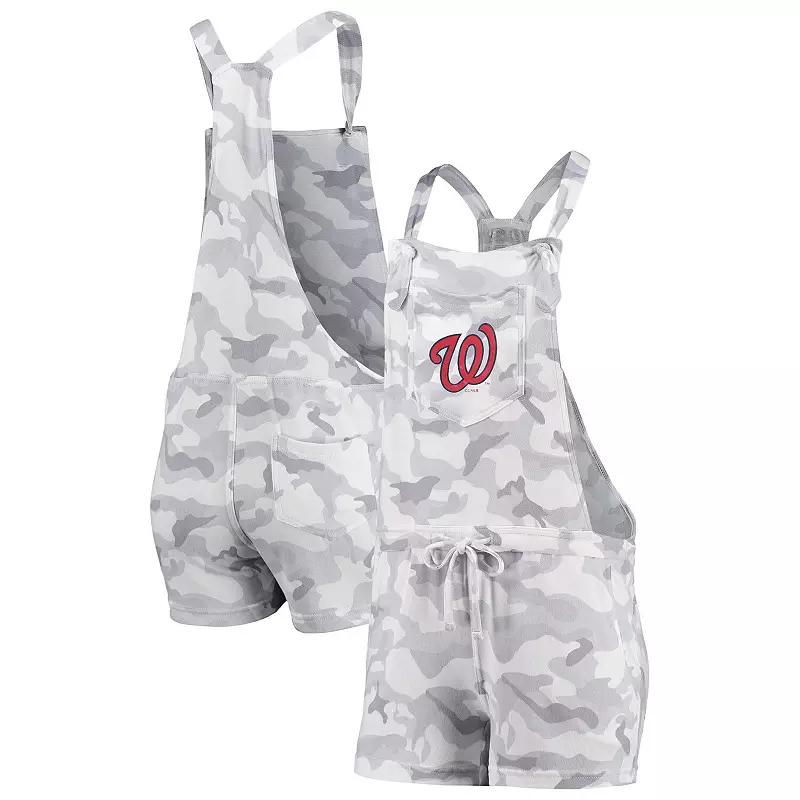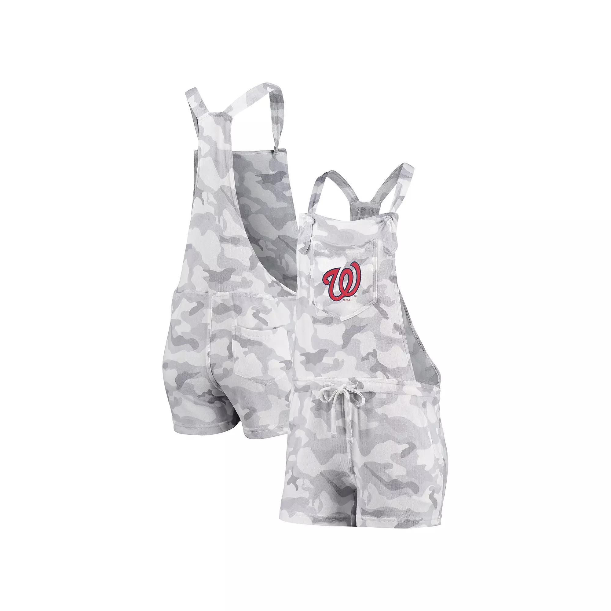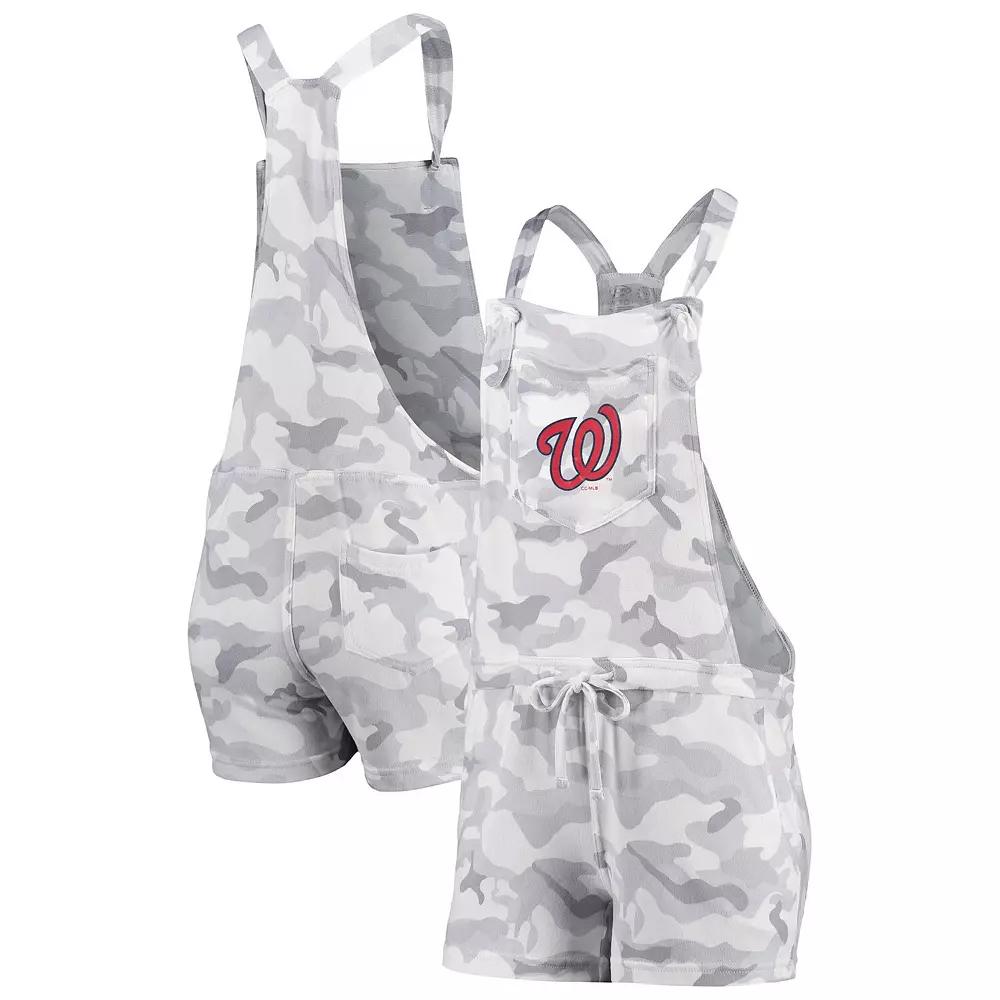 Create a chic look on those extra-hot Washington Nationals game days with this Camo Overall romper from Concepts Sport. It features understated Washington Nationals graphics printed on soft, stretchy fabric and an adjustable drawstring for the most comfortable fit. Plus, multiple pockets keep personal items close at hand.Create a chic look on those extra-hot Washington Nationals game days with this Camo Overall romper from Concepts Sport. It features understated Washington Nationals graphics printed on soft, stretchy fabric and an adjustable drawstring for the most comfortable fit. Plus, multiple pockets keep personal items close at hand.PRODUCT FEATURESAdjustable drawstring at waistBrand: Concepts SportImportedInseam on size S measures approx. 3Machine wash, tumble dry lowMaterial: 94% Polyester/6% SpandexOfficially licensedOne back slip pocketOne chest pocketRacerbackScreen print graphicsShoulder straps with knotted tiesSublimated patternTagless CollarTwo front slip pockets Color: Grey. Gender: female. Age Group: adult.