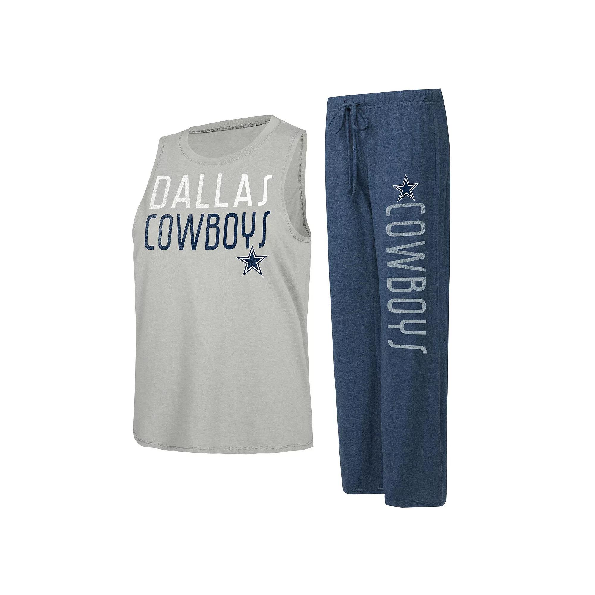 Hang around the house and drift off to sleep comfortably in this Dallas Cowboys lounge set from Concepts Sport. The muscle tank top and pants feature Dallas Cowboys graphics printed on a blend of soft fabrics. An adjustable waistband lets you choose the ideal fit.Hang around the house and drift off to sleep comfortably in this Dallas Cowboys lounge set from Concepts Sport. The muscle tank top and pants feature Dallas Cowboys graphics printed on a blend of soft fabrics. An adjustable waistband lets you choose the ideal fit.PRODUCT FEATURESImportedOfficially licensedMaterial: 60% Cotton/40% PolyesterMachine wash, tumble dry lowSet includes tank top and one pair of pantsElastic waistband with drawstringSleevelessInseam on size S measures approx. 30.5Rounded hemBrand: Concepts SportDistressed screen print graphicsCrew neck Color: Navy. Gender: female. Age Group: adult.