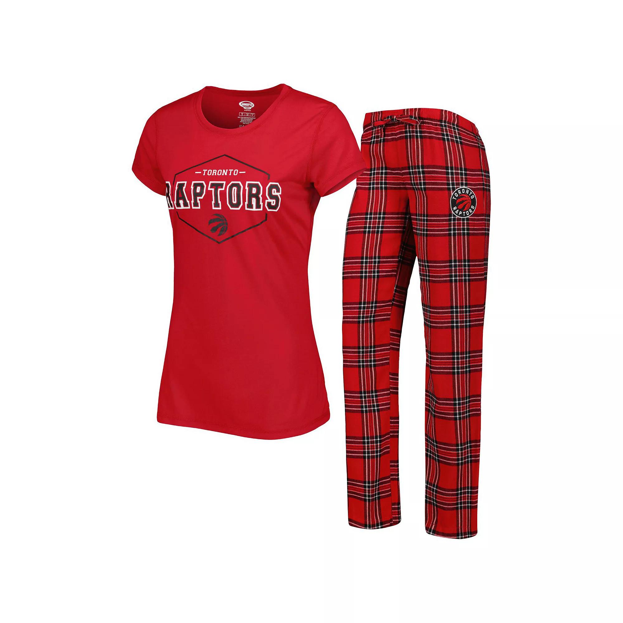 Before the next Toronto Raptors game, be sure that youre well-rested with this Badge T-shirt & pajama pants sleep set from Concepts Sport. Both pieces feature the iconic Toronto Raptors crest, and the bottoms display a striking plaid pattern that is sure to get you amped up for when your favorite squad hits the hardwood. The drawstring-adjustable elastic waistband and flexible fabrics help keep you comfortable throughout every wear.Before the next Toronto Raptors game, be sure that youre well-rested with this Badge T-shirt & pajama pants sleep set from Concepts Sport. Both pieces feature the iconic Toronto Raptors crest, and the bottoms display a striking plaid pattern that is sure to get you amped up for when your favorite squad hits the hardwood. The drawstring-adjustable elastic waistband and flexible fabrics help keep you comfortable throughout every wear.PRODUCT FEATURESImportedSet includes T-shirt and pajama pantsMaterial: 65% Polyester/35% Rayon - Shirt; 60% Cotton/40% Polyester - PantsMachine wash, tumble dry lowScreen print graphicsBrand: Concepts SportOfficially licensedWoven plaid patternShort sleeveInseam for size S measures approx. 29Elastic waistband with drawstringCrew neckEmbroidered graphics Color: RPT RED. Gender: female. Age Group: adult.