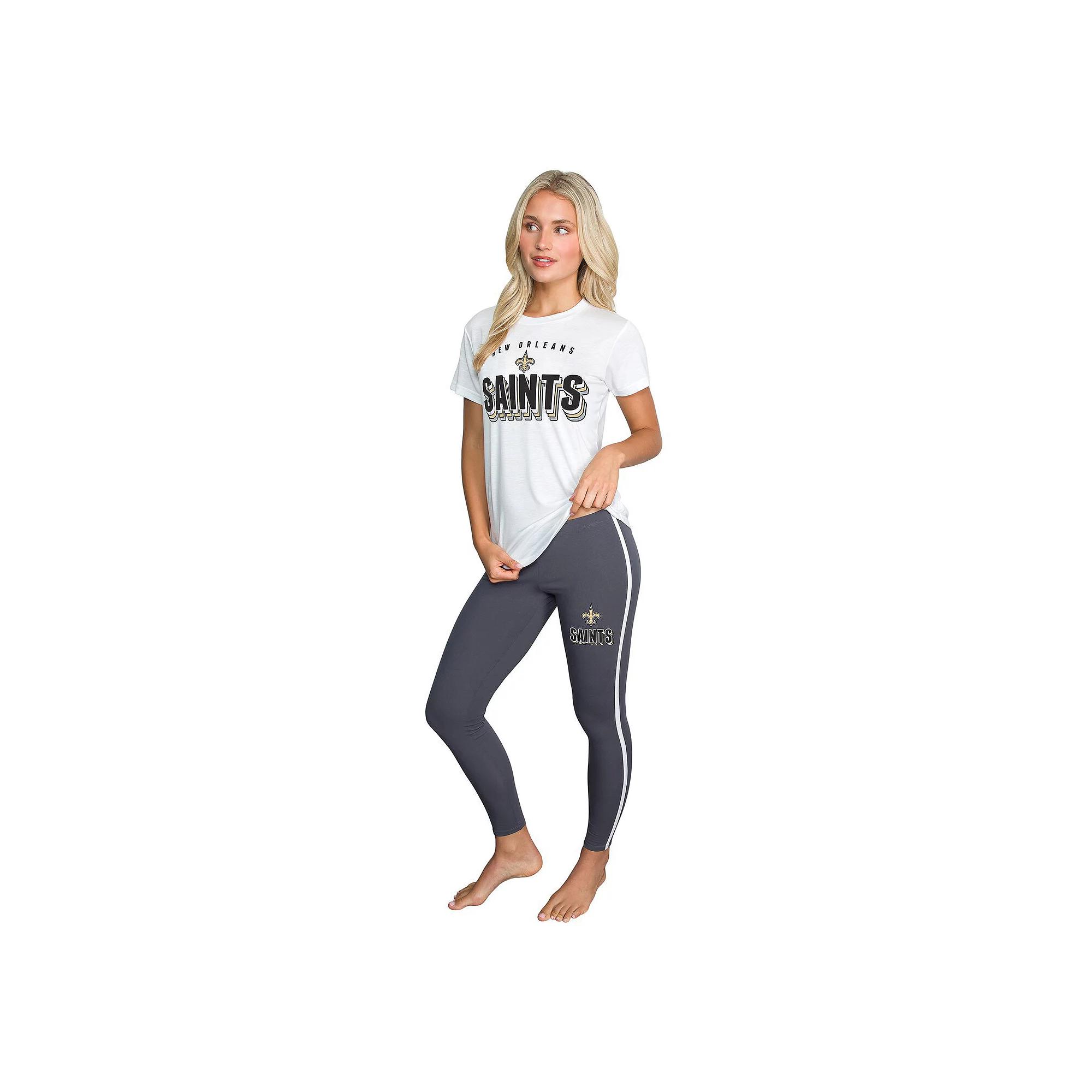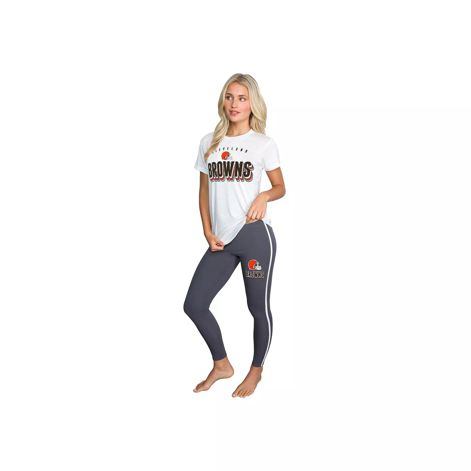Sometimes you like to cheer on the Cleveland Browns from the comfort of your home, and this Concepts Sport Sonata set makes it that much easier. Includes a comfortable tee and leggings with eye-catching Cleveland Browns graphics and details. This set's soft, stretchy fabric also offers a casual feel. Set includes T-shirt with rounded hem and leggings. Short sleeve. Imported. Officially licensed. Inseam on size S measures approx. 28''. Sewn-on stripes. Crew neck. Brand: Concepts Sport. Screen print graphics. Elastic waistband. Color: White. Gender: female. Age Group: adult. Material: COTTON.