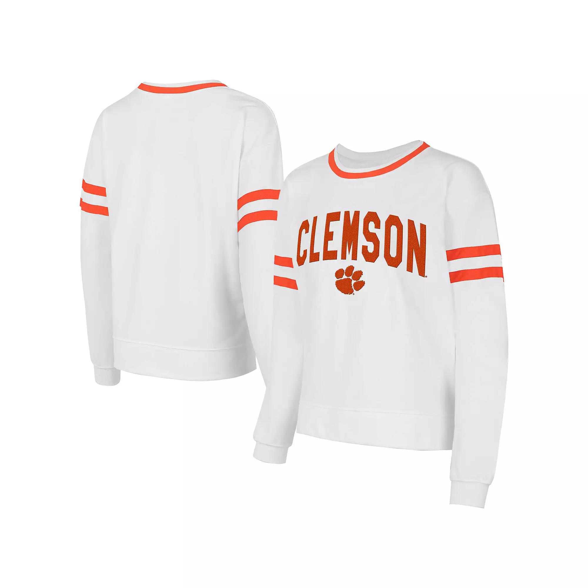 Embrace ultimate Clemson Tigers style and comfort with the Concepts Sport Borough French Terry Arch Over Long Sleeve T-Shirt. Made from a blend of soft cotton and durable polyester, this tee provides a comfortable and stylish wear for everyday activities. The long sleeve design features sewn-on stripes for a touch of athletic flair, making it an ideal choice for both game day and casual outings.Embrace ultimate Clemson Tigers style and comfort with the Concepts Sport Borough French Terry Arch Over Long Sleeve T-Shirt. Made from a blend of soft cotton and durable polyester, this tee provides a comfortable and stylish wear for everyday activities. The long sleeve design features sewn-on stripes for a touch of athletic flair, making it an ideal choice for both game day and casual outings.PRODUCT FEATURESCrew neckLong sleeveImportedMaterial: 70% Cotton/30% PolyesterSewn-on stripes at sleevesMachine wash, tumble dry lowBrand: Concepts SportTeam wordmark applique graphic on the chestOfficially licensed Size: 2X. Color: White. Gender: female. Age Group: adult.
