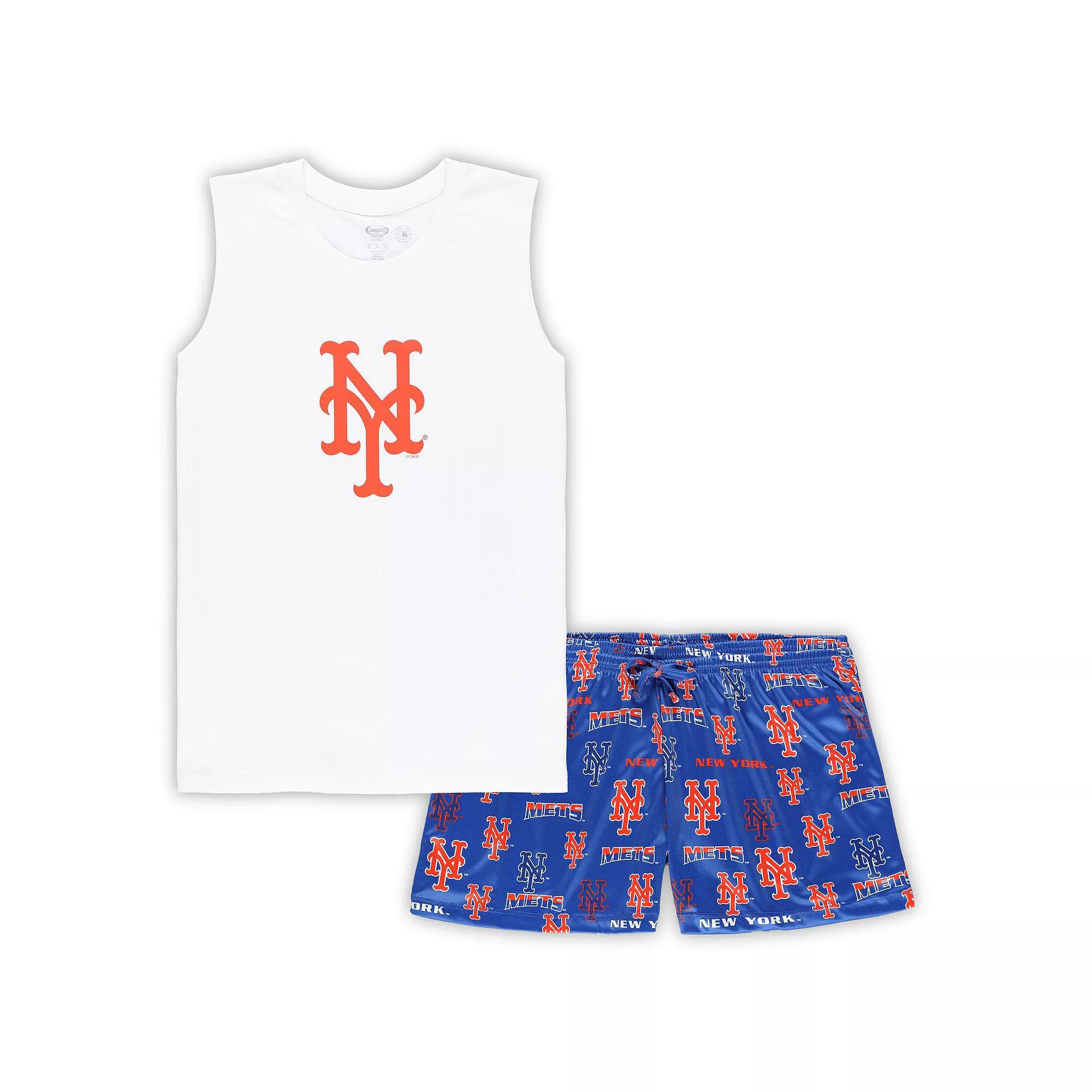 Relax and enjoy a great game from home with this charming New York Mets Sleep set by Concepts Sport. It includes a tank top that promotes breathability and shorts with an elastic waistband. An eye-catching pattern helps the striking New York Mets graphics stand out.Relax and enjoy a great game from home with this charming New York Mets Sleep set by Concepts Sport. It includes a tank top that promotes breathability and shorts with an elastic waistband. An eye-catching pattern helps the striking New York Mets graphics stand out.PRODUCT FEATURESSet includes tank top and shortsMaterial: 100% Cotton - Tank Top; 100% Polyester - ShortsMachine wash, tumble dry lowImportedOfficially licensedSleevelessInseam for size 1X measures approx. 4Brand: Concepts SportElastic waistband with drawstringCrew neckScreen print graphics Size: 4X. Color: White. Gender: female. Age Group: adult.