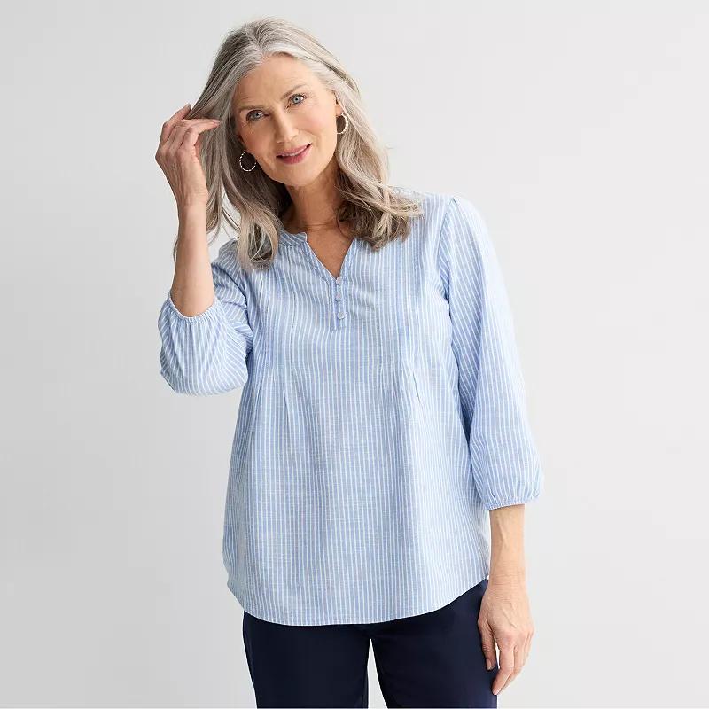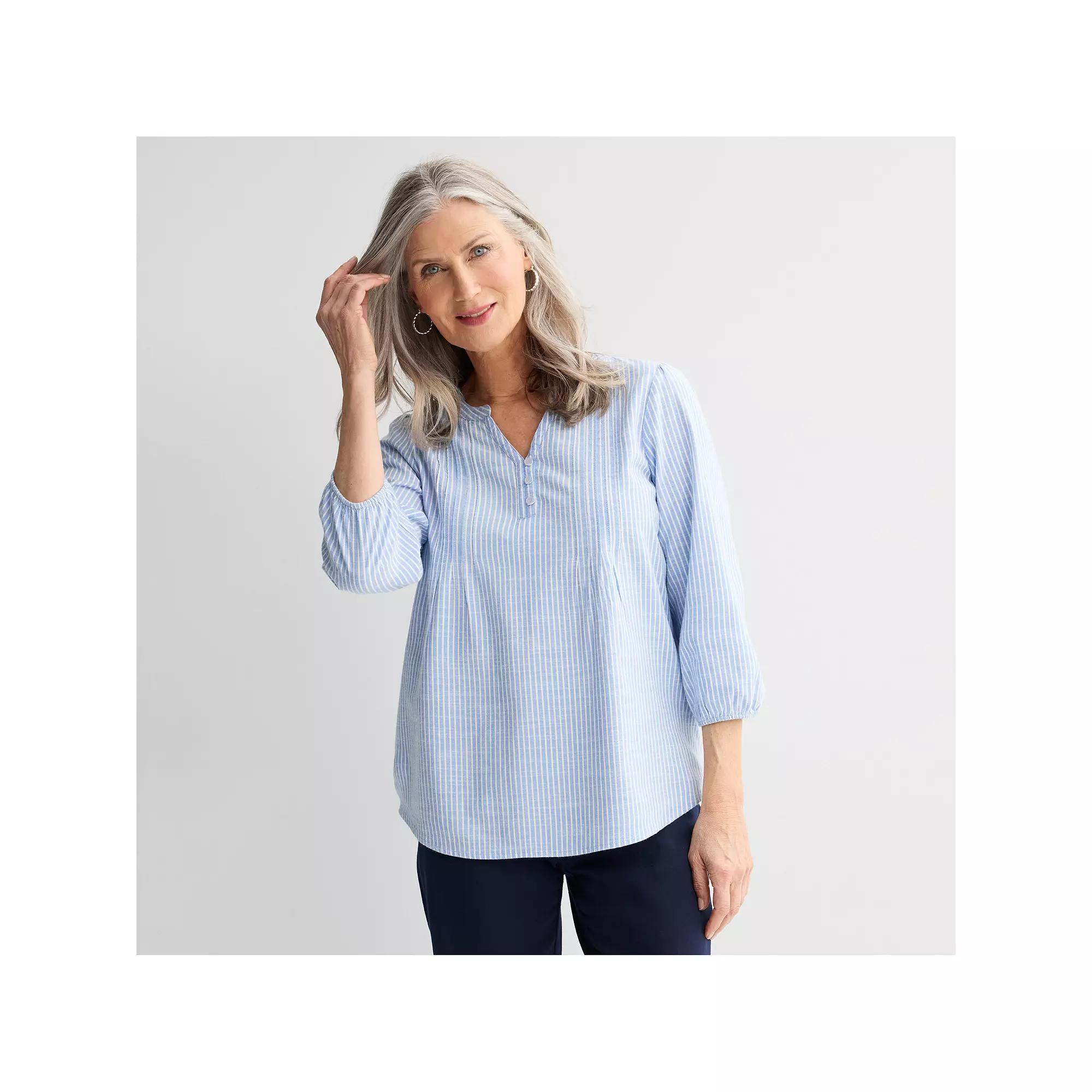 Elevate your everyday style with this charming Croft & Barrow top, designed to make you feel effortlessly chic. With delightful button pintucks and a playful print, it's perfect for those days when you want to look fabulous with minimal fuss—because who doesn't want a shirt that does half the work for you? Click on this WOMEN'S GUIDE to find the perfect fit and more! - https://www.kohls.com/feature/womens-fit-guide.jsp. FEATURES: Woven plain weave fabric with soft handfeel. FIT & SIZE: Regular fit, 27 1/2-in. length from shoulder to hem, Shirttail hem. MATERIAL & CARE: Body: cotton, viscose, Care: machine wash. DETAILS: 3-button front closure, Y-neck, 3/4-length sleeves, Elastic cuffs, Imported. RESPONSIBLE Supports more sustainable cotton farming. Size: Small. Color: Soft Blue Shirt Stripe. Gender: female. Age Group: adult. Material: RAYON.