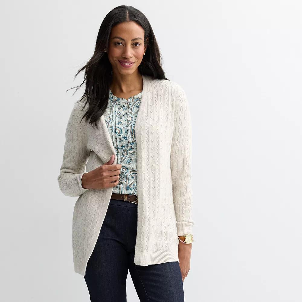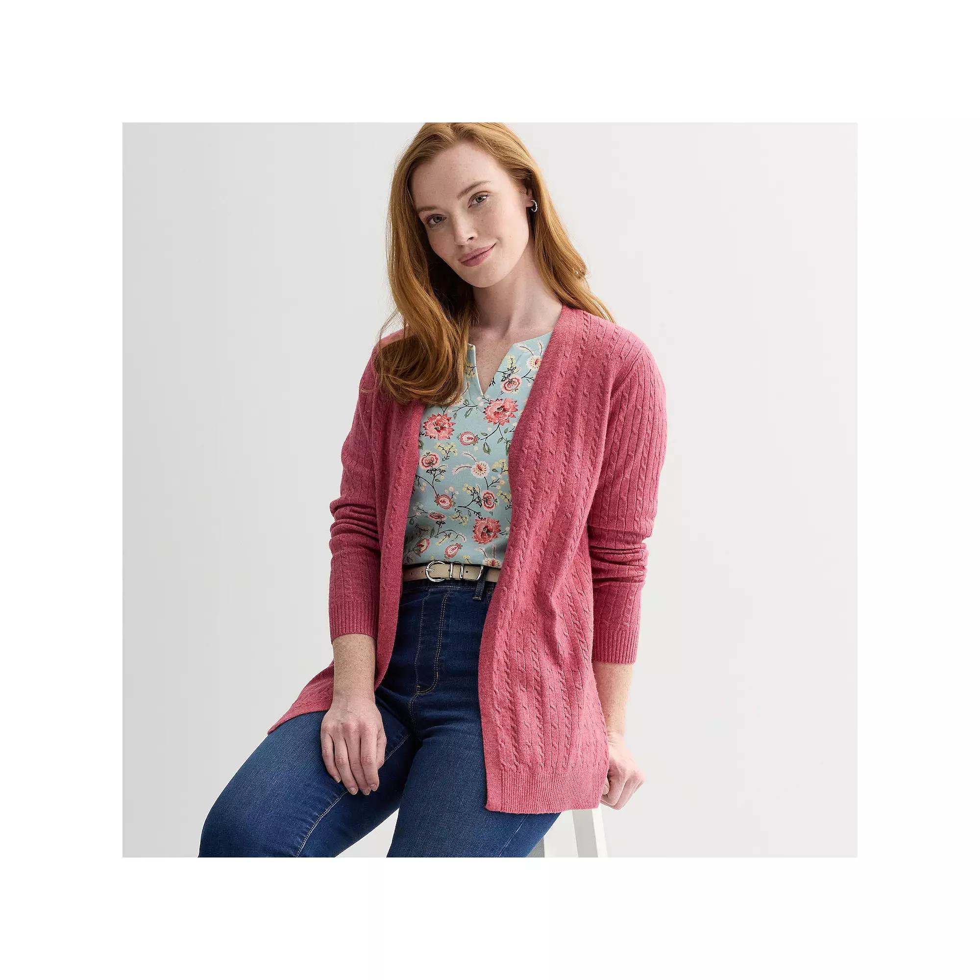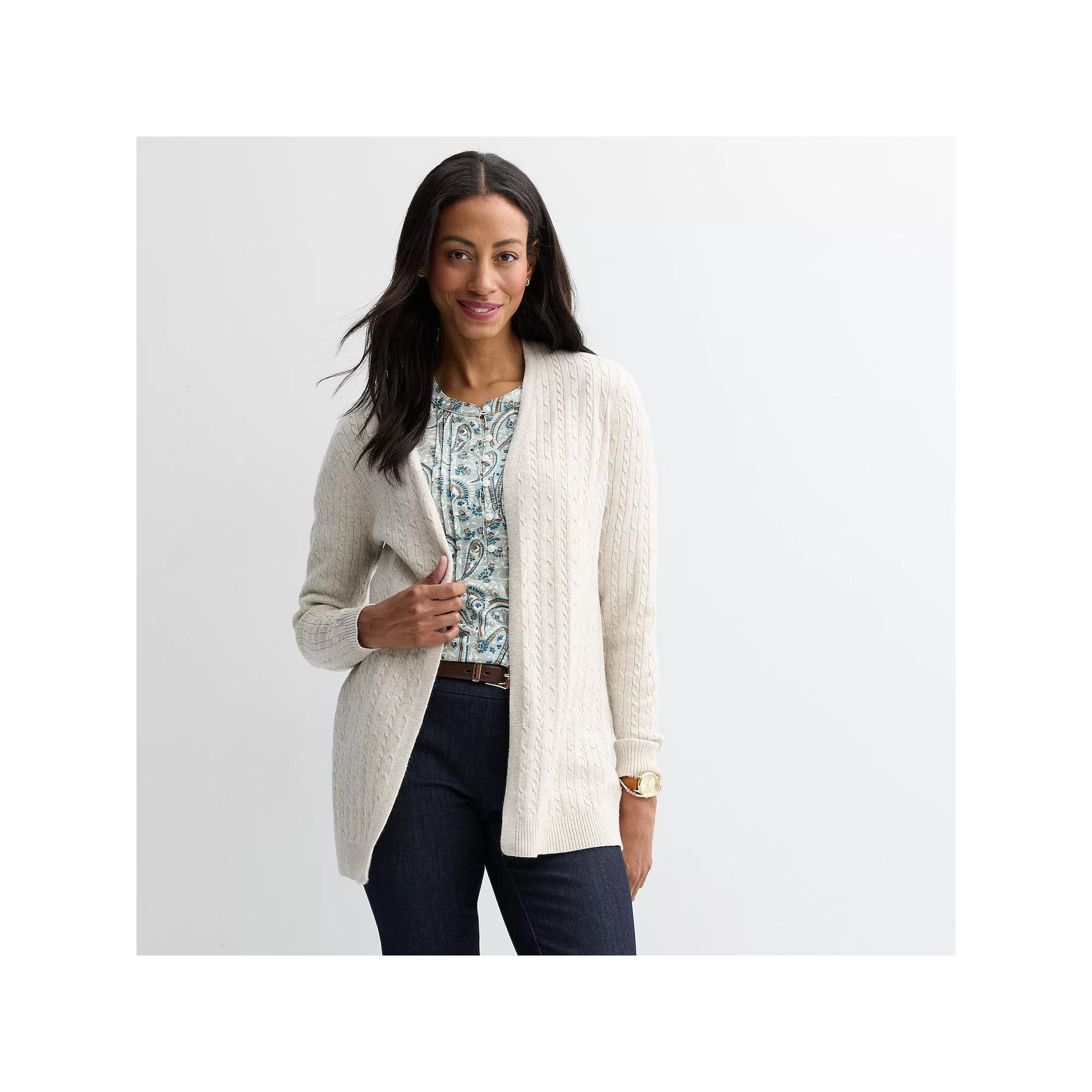 Snuggle up in style with this delightful cardigan that has the perfect balance of cozy charm and chic sophistication. With its lovely cabled design and open-front style, it's like a warm hug that effortlessly completes any outfit, making every coffee run or casual outing feel a bit more special. Click on this WOMEN'S GUIDE to find the perfect fit and more! - https://www.kohls.com/feature/womens-fit-guide.jsp. FEATURES: Soft feel for comfort. FIT & SIZE: Casual fit with slight ease in body, 31-in. length from shoulder to hem. DETAILS: No closure - open front, Long sleeves, Imported. MATERIAL & CARE: 100% Recycled polyester, Machine wash. Size: Small. Color: Fossil Heather. Gender: female. Age Group: adult. Material: ACRYLIC BLEND.