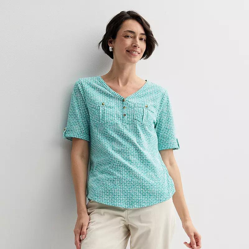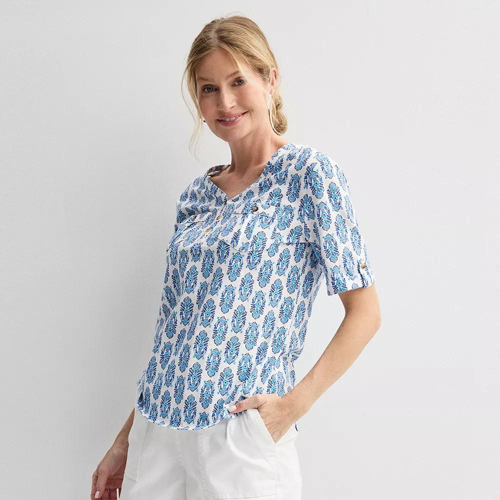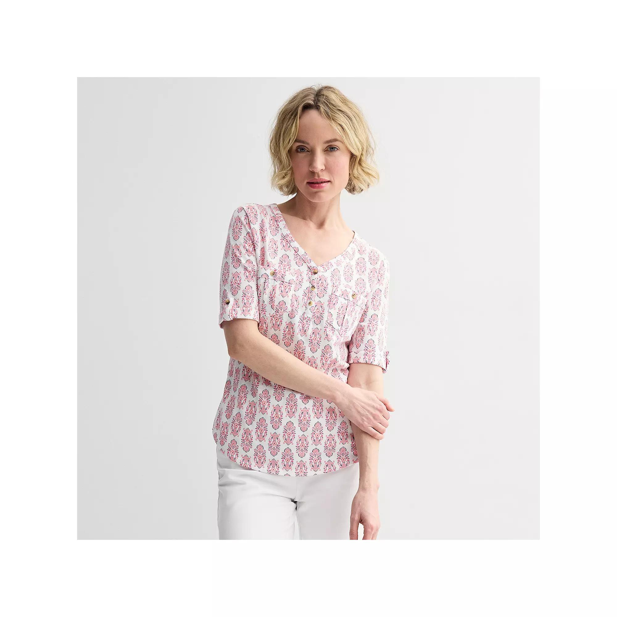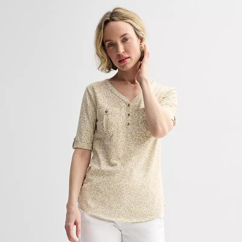 Upgrade your essentials with this women's Croft & Barrow utility henley top. Click on this WOMEN'S GUIDE to find the perfect fit and more! - https://www.kohls.com/feature/womens-fit-guide.jsp. 3-button placket, Roll-tab elbow sleeves, Jersey construction, 2 chest pockets. FABRIC & CARE: Cotton, polyester, Machine wash, Imported. SUSTAINABILITY FEATURES: Supports more sustainable cotton farming. Size: X Large. Color: Beige Texture Palms. Gender: female. Age Group: adult. Material: OTHER MATERIAL.