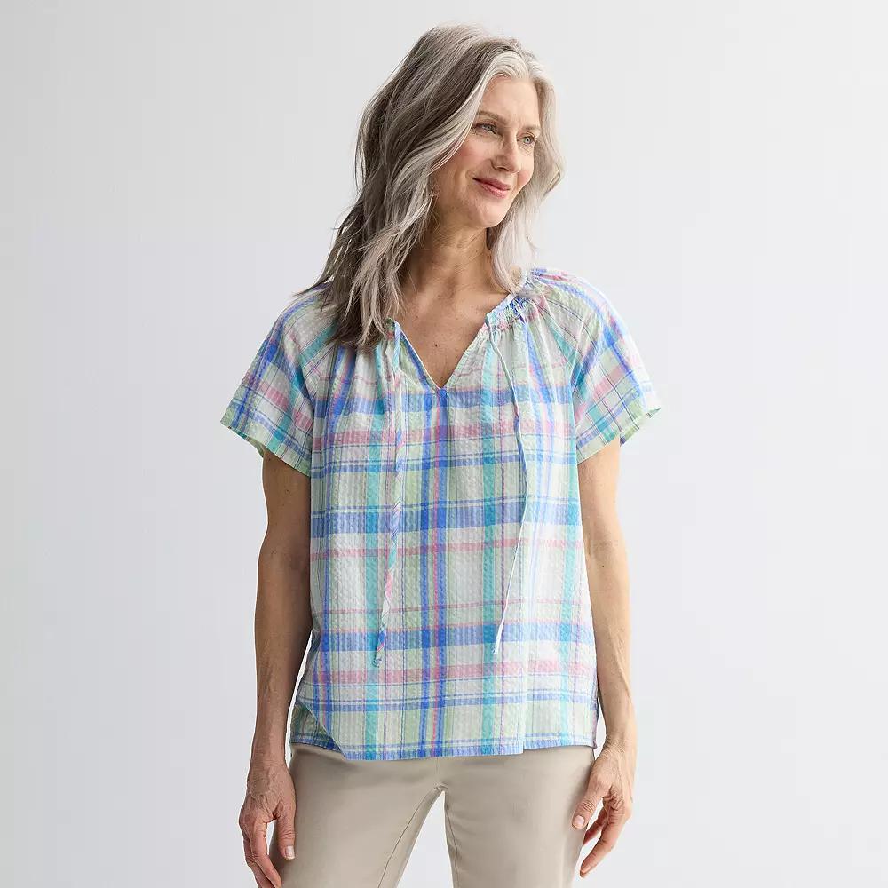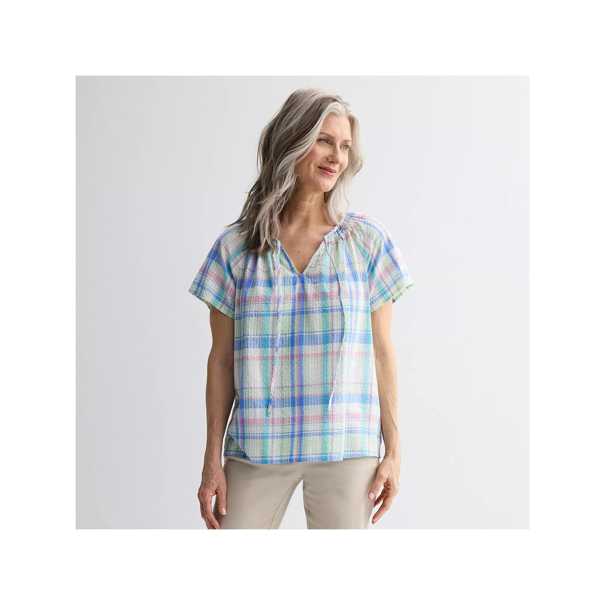 Elevate your wardrobe with this stylish raglan split neck blouse from Croft & Barrow. The relaxed fit and versatile neckline make it perfect for casual outings or layered under a jacket for a polished look, offering endless styling possibilities for any occasion. Click on this WOMEN'S GUIDE to find the perfect fit and more! - https://www.kohls.com/feature/womens-fit-guide.jsp. FEATURES: Tie closure, V-neck, Short sleeves, Straight hem, Unlined. FIT & SIZING: 26 1/4-in. length from shoulder to hem. FABRIC & CARE: Cotton, modal, Machine wash, Imported. Size: X Small. Color: Green Madras Plaid. Gender: female. Age Group: adult. Material: OTHER MATERIAL.