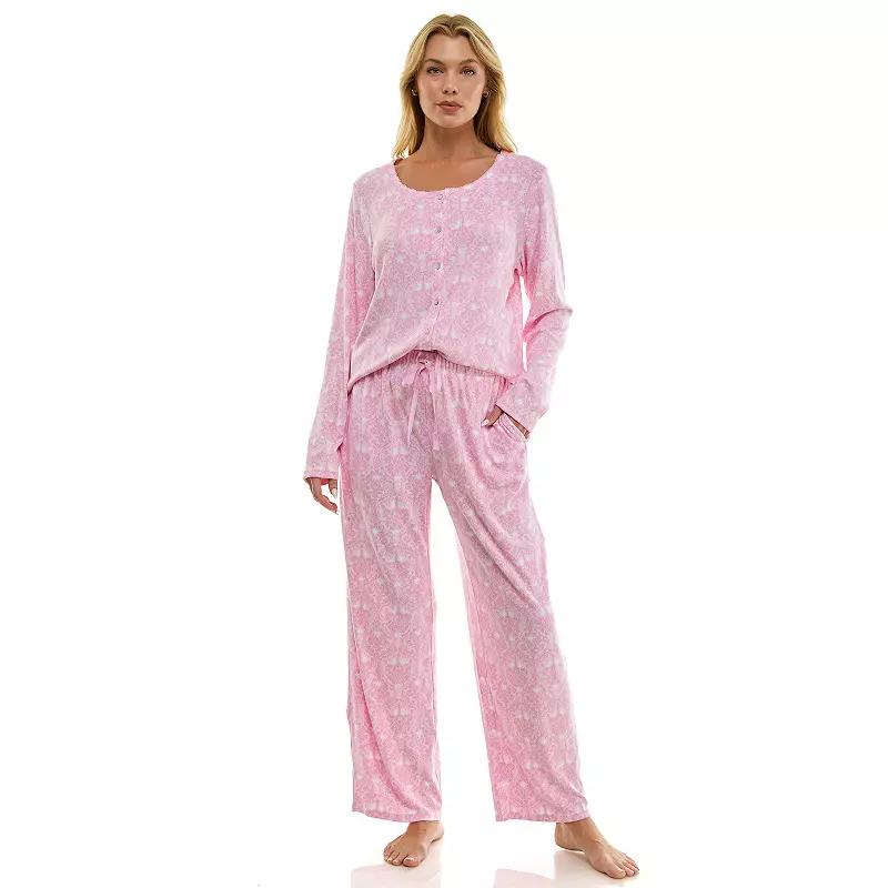 Wrap yourself in luxurious comfort with this adorable sleepwear set that blends style and coziness effortlessly. The short-sleeve Henley tee, adorned with picot trim and charming glitter-rimmed buttons, pairs perfectly with pants featuring a turnback waistband and handy pockets, making this the go-to choice for lounging or catching some Z's in style. Click on this INTIMATES & SLEEPWEAR GUIDE to find the perfect fit and more! - https://www.kohls.com/feature/womens-sleepwear-and-intimates-guide.jsp. FEATURES: Soft, lightweight fabric feels as light as a feather, Versatile, all-weather material for year-round wear, Gentle stretch from spandex for ease of movement, Two side seam pockets for convenient functionality. FIT & SIZE: High rise sits below the natural waistline, Wide 9 1/2-in. leg opening, Petite pants: 26-in. inseam, Relaxed fit. DETAILS: 2-pc. set includes: pajama top and bottoms, Top: Henley neckline, short sleeves, 3-button front closure, Pants: drawstring elastic waistband, 2 side seam pockets, Imported. MATERIAL & CARE: Polyester, Spandex, Machine wash. Size: XL Petite. Color: Juliette Floral Cloud. Gender: female. Age Group: adult. Material: POLY BLEND.