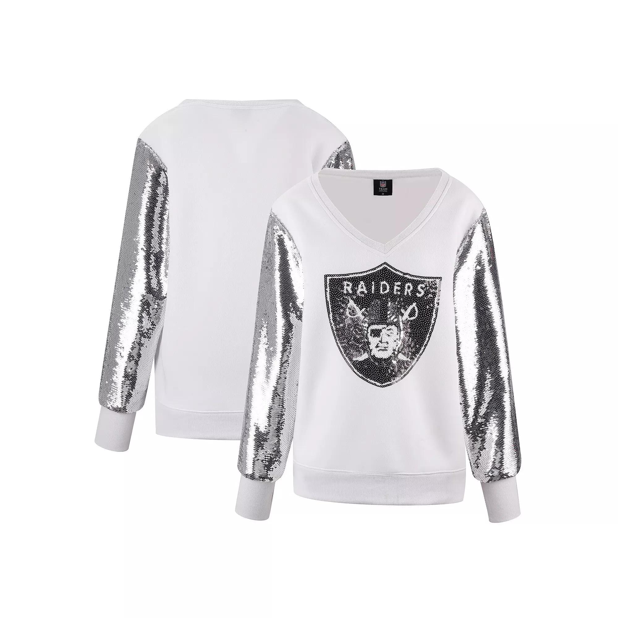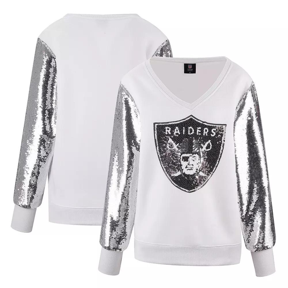 Sparkle and shine while supporting your Las Vegas Raiders with this Cuce Sequin Sleeve V-Neck Pullover Sweatshirt. This dazzling sweatshirt features sparkling sequin sleeves and a large sequin team logo at the center front, adding a touch of glam to your game day attire. A brushed fleece lining and rib-knit accents at the collar, hem, and sleeve cuffs provide ultimate comfort for cheering on the Raiders.Sparkle and shine while supporting your Las Vegas Raiders with this Cuce Sequin Sleeve V-Neck Pullover Sweatshirt. This dazzling sweatshirt features sparkling sequin sleeves and a large sequin team logo at the center front, adding a touch of glam to your game day attire. A brushed fleece lining and rib-knit accents at the collar, hem, and sleeve cuffs provide ultimate comfort for cheering on the Raiders.PRODUCT FEATURESMaterial: 100% PolyesterV-neckOfficially licensedBrand: CuceSequin sleevesPulloverHand wash, line dryImportedRib-knit collar, hem and sleeve cuffs for a snug and comfortable fitBrushed fleece liningLightweight sweatshirt suitable for mild temperaturesLong sleeveLarge sequin team logo at center front Size: 2X. Color: Lvr White. Gender: female. Age Group: adult.