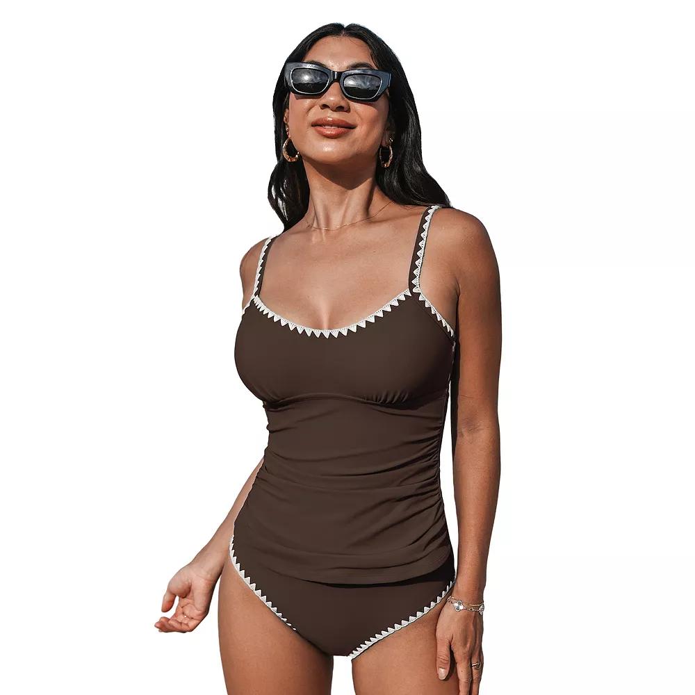 Dive into summer fun with this sporty tankini set from Cupshe, designed for both style and comfort. Featuring adjustable straps and removable soft cups, this two-piece ensures a flattering fit that lets you move with ease, making it perfect for splashing in the waves or lounging poolside. Click on this WOMEN'S GUIDE to find the perfect fit and more! - https://www.kohls.com/feature/womens-fit-guide.jsp. FEATURES: 2-piece tankini set includes top and bottoms, Top: scoopneck, sleeveless, adjustable straps, Bottoms: elastic waistband. FIT & SIZE: Midrise sits on the high hip. DETAILS: No closure - pull-on styling, Removable cups, Wireless, Moderate coverage, Model no. DAA12D5D047BB, DAA12D5D046RR, DAA12D5B035EE, DAA12D5D048HJ. MATERIAL & CARE: Nylon, spandex, Lining: polyester, spandex, Partially lined, Unlined gusset, Hand wash, Imported. Size: Large. Color: Brown. Gender: female. Age Group: adult. Material: NYLON SPANDEX.