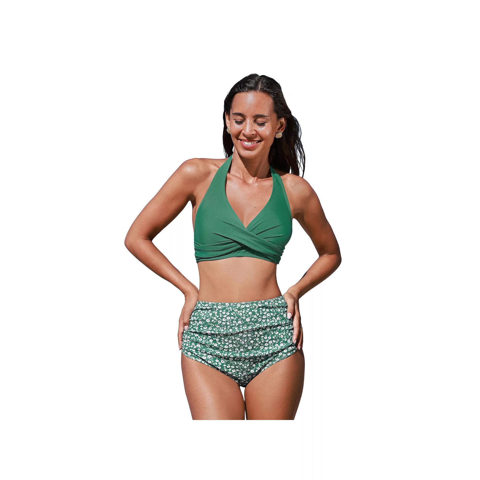 Dive into summer bliss with this charming high-waist bikini set that promises both style and comfort. The Cupshe halterneck top features a flattering V-neckline and beautifully ruched fabric, ensuring you feel confident whether you're lounging poolside or catching waves at the beach. Click on this WOMEN'S GUIDE to find the perfect fit and more! - https://www.kohls.com/feature/womens-fit-guide.jsp. FEATURES: V-neckline and halterneck design, Ruched fabric for a flattering fit, Adjustable straps for customizable support, Removable cups for versatile styling, Standard rise with classic bum coverage. FIT & SIZE: High rise sits below the natural waistline, Elastic waistband. MATERIAL & CARE: Body: nylon, spandex, Lining: polyester, spandex, Partially lined, Lined gusset, Hand wash. DETAILS: 2-piece set includes swim top and swim bottoms, Hook & loop closure, Wireless, 1 hook row, 1 hook column, Adjustable straps, Moderate coverage, V-neck, Sleeveless, Imported. Size: Medium. Color: Green. Gender: female. Age Group: adult. Material: NYLON SPANDEX.