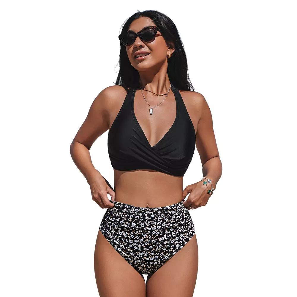 Get ready to turn heads and soak up the sun in this fabulous bikini set from Cupshe. With a V-neck halter top featuring a chic front twist and flattering ruched fabric, you’ll feel both stylish and secure, while the high-waisted bottoms add a little extra flair for those lovely beach strolls. Click on this WOMEN'S GUIDE to find the perfect fit and more! - https://www.kohls.com/feature/womens-fit-guide.jsp. FEATURES: V-neck halter top with ruched fabric for a flattering silhouette, Elegant front wrap design, Secure back hook closure, High-waisted bottoms for added coverage, Removable cups for customizable support. FIT & SIZE: High rise sits below the natural waistline, Elastic waistband. MATERIAL & CARE: Nylon, spandex, Unlined, Unlined gusset, Hand wash. DETAILS: 2-piece set includes swim top and swim bottoms, Hook & loop closure, Wireless, 1 hook row, 1 hook column, Adjustable straps, Moderate coverage, V-neck, Sleeveless, Imported. Size: Large. Color: Black. Gender: female. Age Group: adult. Material: NYLON SPANDEX.