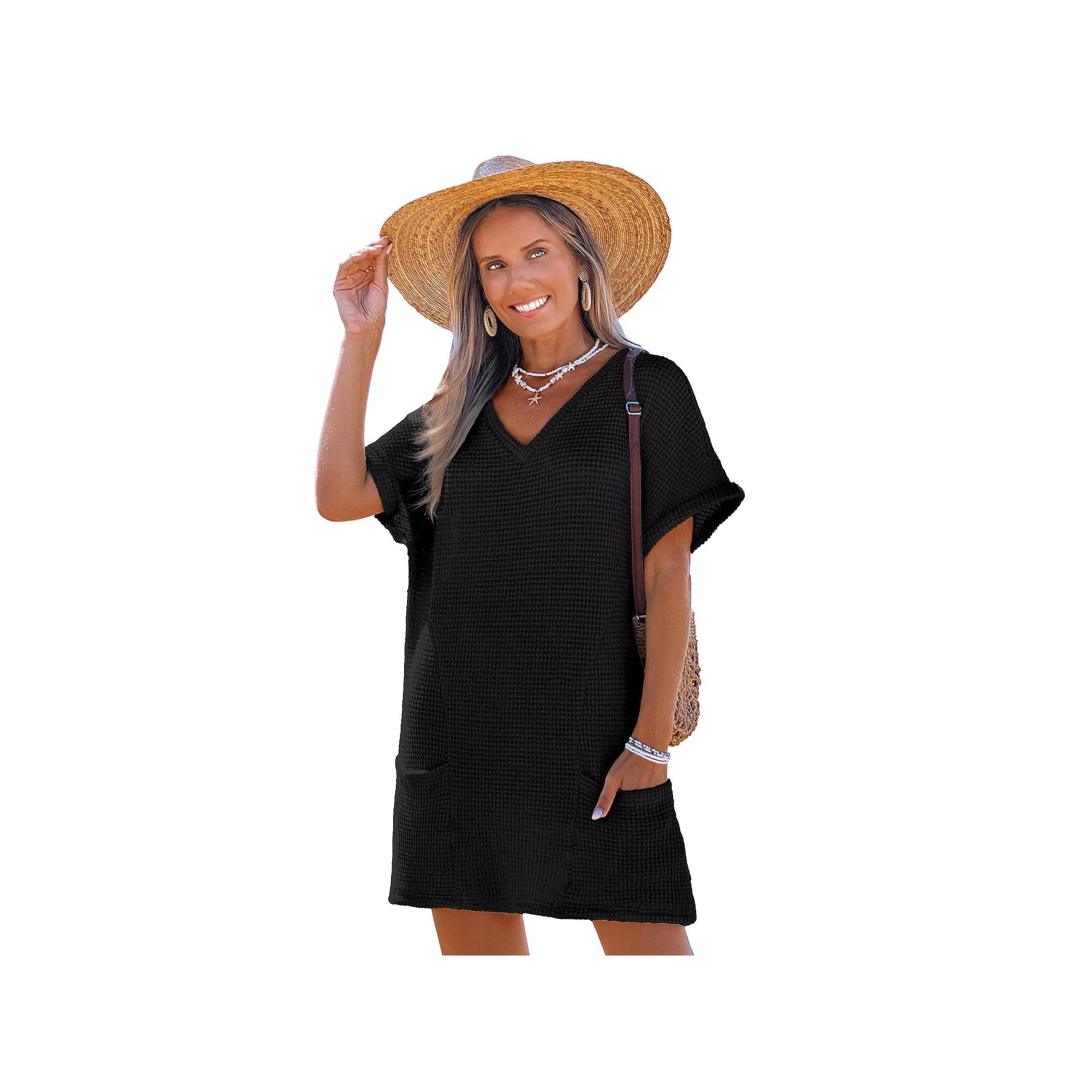 Slip into effortless style with this cozy mini dress, perfect for beach days or casual outings. Featuring a flattering V-neckline, handy pockets, and short sleeves, this Cupshe gem is your go-to for laid-back fun while keeping you feeling cute and chic all day long. Click on this WOMEN'S GUIDE to find the perfect fit and more! - https://www.kohls.com/feature/womens-fit-guide.jsp. FEATURES: Woven design for a stylish look, V-neckline adds a touch of elegance, Short sleeves for comfort and breathability, Convenient pockets for practicality, Mini length for a trendy silhouette. FIT & SIZE: 30 1/4-in. length from shoulder to hem, Banded hem. MATERIAL & CARE: Polyester, spandex, Unlined, Hand wash. DETAILS: No closure - pullover styling, V-neck, Short sleeves, 2 pockets, Imported. Size: Medium. Color: Black. Gender: female. Age Group: adult. Material: COTTON.