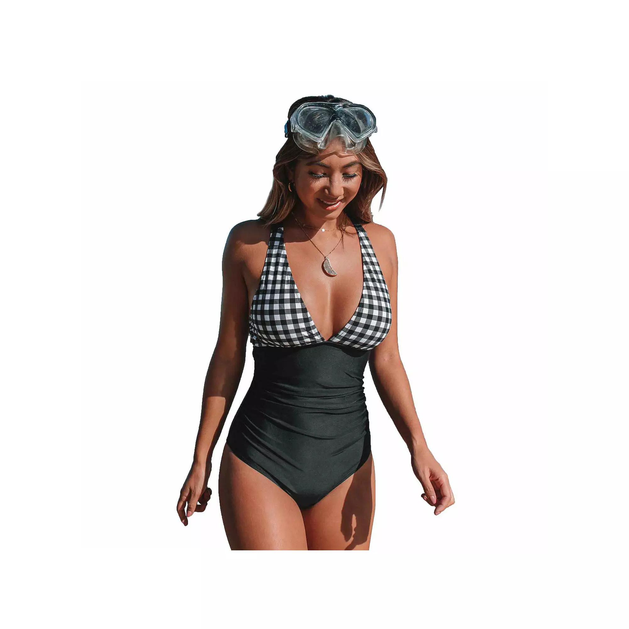 Youll love the retro styling and flattering fit of this womens Cupshe cross-back swimsuit. Youll love the retro styling and flattering fit of this womens CUPSHE cross-back swimsuit. Tummy slimmer Gingham print bodice V-Neck Ruched detailsFIT & SIZING Cross-back straps Removable bra cups Medium-ImpactFABRIC & CARE Shell: chinlon, spandex Lining: polyester Hand wash Imported Size: X Small. Color: Black. Gender: female. Age Group: adult.