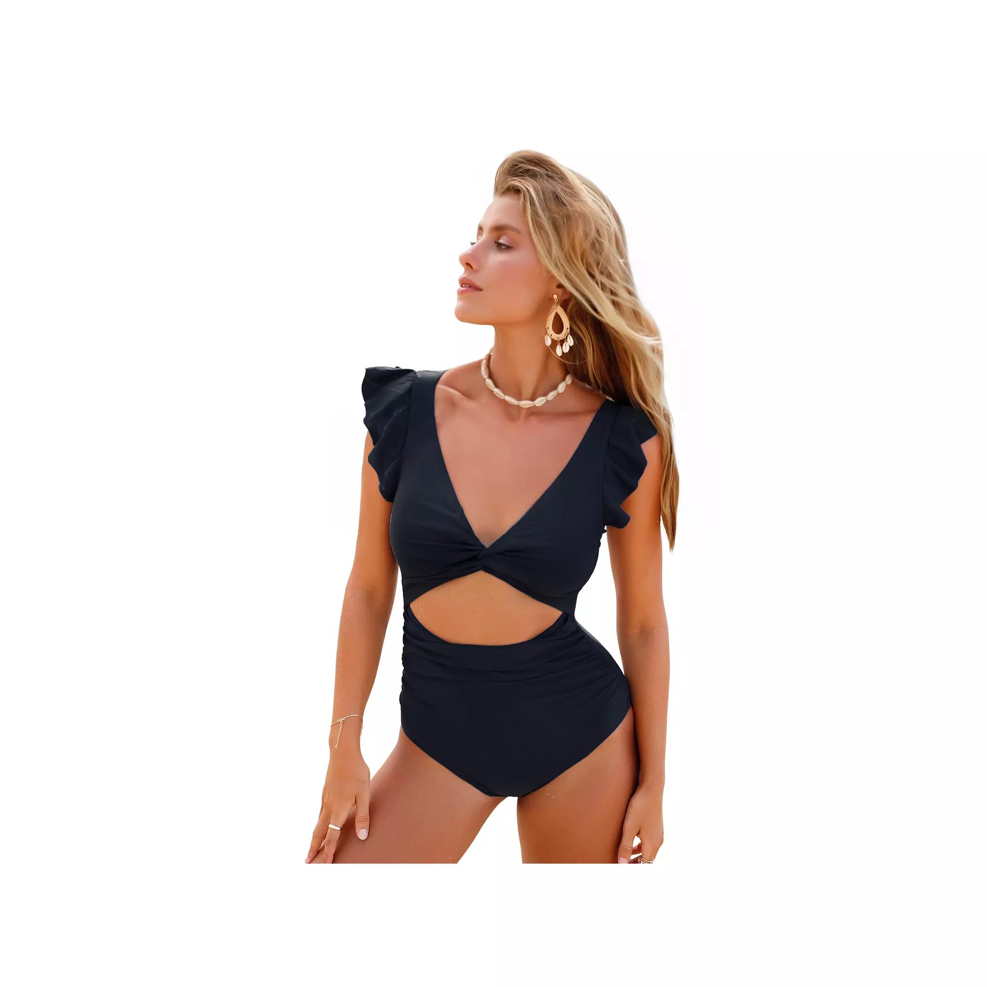 Dive into summer fun with this stylish one-piece that combines a plunging neckline and playful flutter sleeves for a look that's both flirty and fabulous. With features like a front twist and cutout design, you'll feel confident and chic whether you're lounging by the pool or making a splash at the beach—all thanks to Cupshe's thoughtful design for that perfect fit. Click on this WOMEN'S GUIDE to find the perfect fit and more! - https://www.kohls.com/feature/womens-fit-guide.jsp. FEATURES: Plunging neckline and front cutout design, Flutter sleeves for added femininity, Removable soft cups for customizable support, Standard cut leg with classic bum coverage. MATERIAL & CARE: Nylon, spandex, Unlined, Hand wash. DETAILS: Hook & loop closure, Wireless, 1 hook row, 1 hook column, No straps, Moderate coverage, V-neck, Short sleeves, Imported. Size: X Large. Color: Black. Gender: female. Age Group: adult. Material: NYLON SPANDEX.
