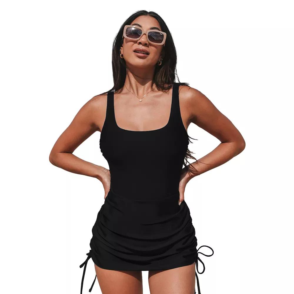 Dive into summer fun with the stylish swim dress from Cupshe, designed to make you shine by the pool. Featuring a flattering square neck and adjustable straps, this one-piece swimsuit combines comfort and confidence with its ruched fabric and chic drawstring details, ensuring you feel fabulous whether you're swimming or lounging. Click on this WOMEN'S GUIDE to find the perfect fit and more! - https://www.kohls.com/feature/womens-fit-guide.jsp. FEATURES: No closure - pullover styling, Sleeveless, Squareneck, Wireless, Removable cups, Unlined, Unlined gusset. FIT & SIZING: Full coverage, Adjustable straps. FABRIC & CARE: Nylon, spandex, Hand wash, Imported. Size: X Small. Color: Black. Gender: female. Age Group: adult. Material: NYLON SPANDEX.