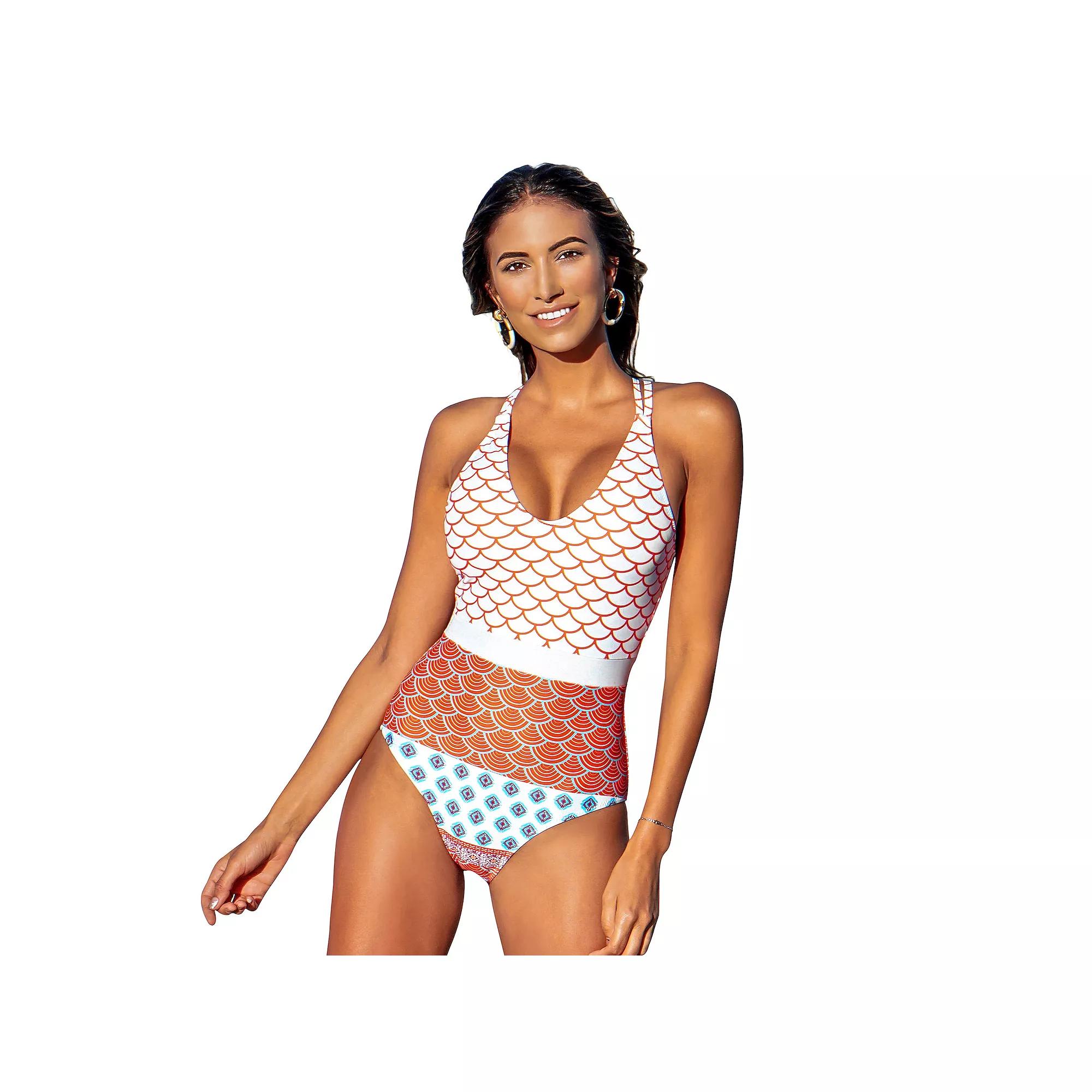 Pretty and printed. Our geo-print one piece swimsuit will have you ready for summer. Features a double strappy crisscross back with padded cups. Scoop neckline with cheeky coverage. Get ready to get some sun in this suit.